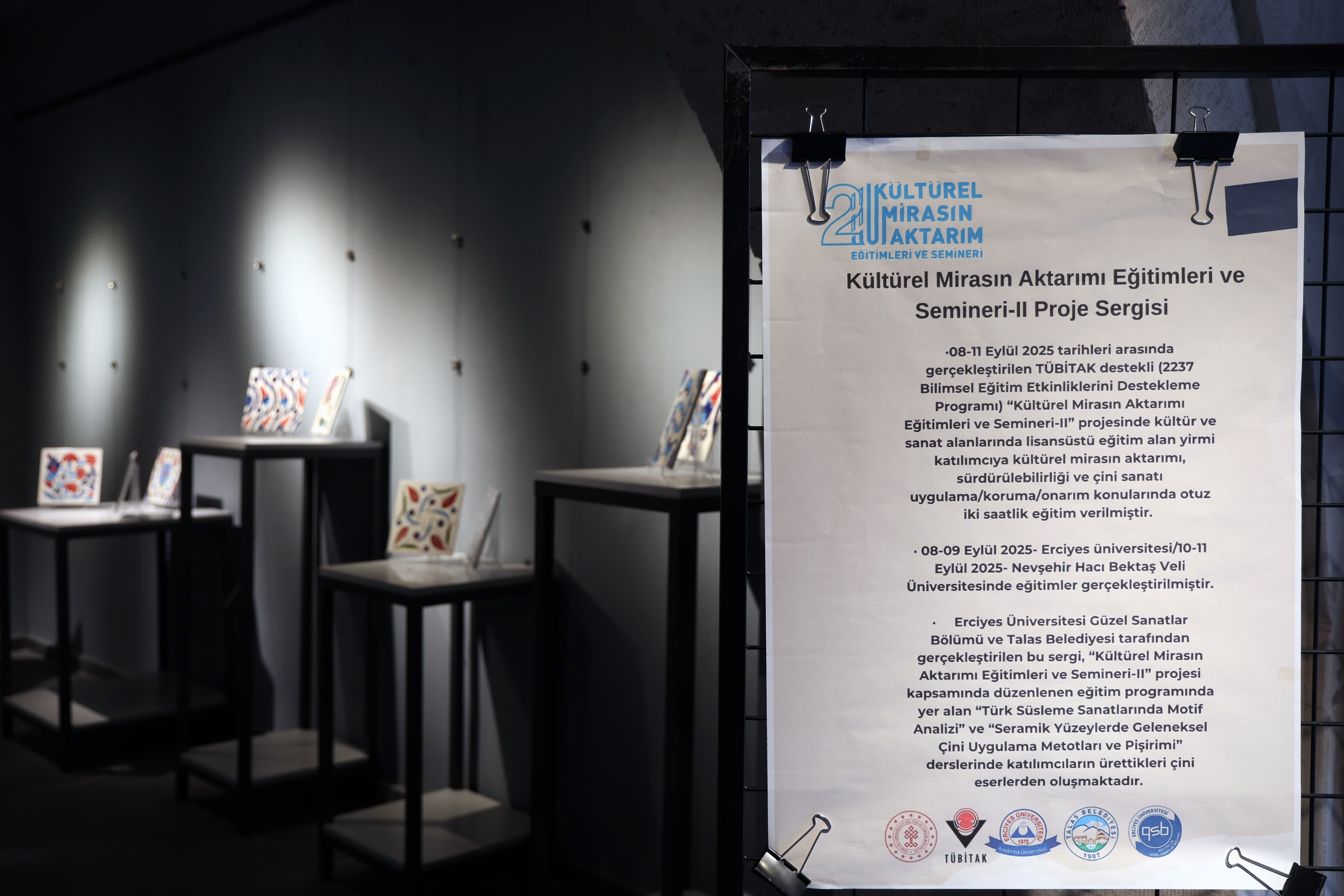 TÜBİTAK tarafından desteklenen proje, Erciyes Üniversitesi (ERÜ), Talas Belediyesi ve Kayseri Üniversitesi iş birliğiyle gerçekleştirildi. İki günlük uygulamalı eğitimlerin sonunda ortaya çıkan eserler, 'Kültürel Mirasın İzinde' başlığıyla sanatseverlerin beğenisine sunuldu. Sergide; Türk süsleme sanatlarında motif analizi ve seramik yüzeylerde geleneksel çini uygulama metotları ele alındı. Katılımcılar, geleneksel Türk çini sanatının estetik inceliklerini, tarihsel köklerini ve çağdaş yorumlarını yakından tanıma fırsatı buldu.