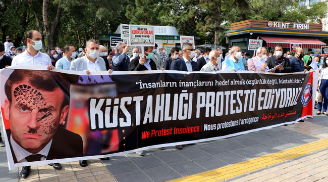 Macron'un resminin yer aldığı ve üzerinde 'küstahlığı protesto ediyoruz' yazılı pankart açan grup adına açıklamayı Memur-Sen İl Temsilcisi Aydın Kalkan yaptı. Kalkan, "Macron'un sözde ifade özgürlüğü adı altında doğrudan insanların inançlarına saldıran ve neresinden bakarsanız bakın kin, nefret ve terörle şekillenmiş zihinler tarafından çizilmiş karikatürlere sahip çıkarak, teröre ve kine ortak olmaktadır. Bu bir akıl yitimidir. Emanuel Macron siyaseten yaşadığı krizi örtmek için özellikle yabancı düşmanı ve ırkçı aşırı sağ siyasetin söylemlerini kullanması, kendi ülkesinin milletvekili tarafından dahi 'bu ülke aklını mı yitirdi' şeklinde eleştirilmiştir. Son birkaç aydır ısrarla İslam ve Müslümanlar üzerinden güç devşirmeye çalışan deyim yerindeyse aklını yitirmiş küresel emperyalist odaklara yardakçılık yapan Macron'u korku çemberi sımsıkı sarmış durumda. Macron insandan, adaletten, İslam’dan korkuyor" dedi. Grup açıklamanın ardından dağıldı.