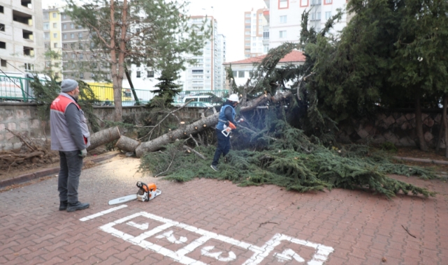 Vatandaşların can ve mal güvenliğini korumak adına Melikgazi Belediyesi ekipleri sahada yerini alırken rüzgarın neden olduğu hasar kısa sürede ortadan kaldırıldı.