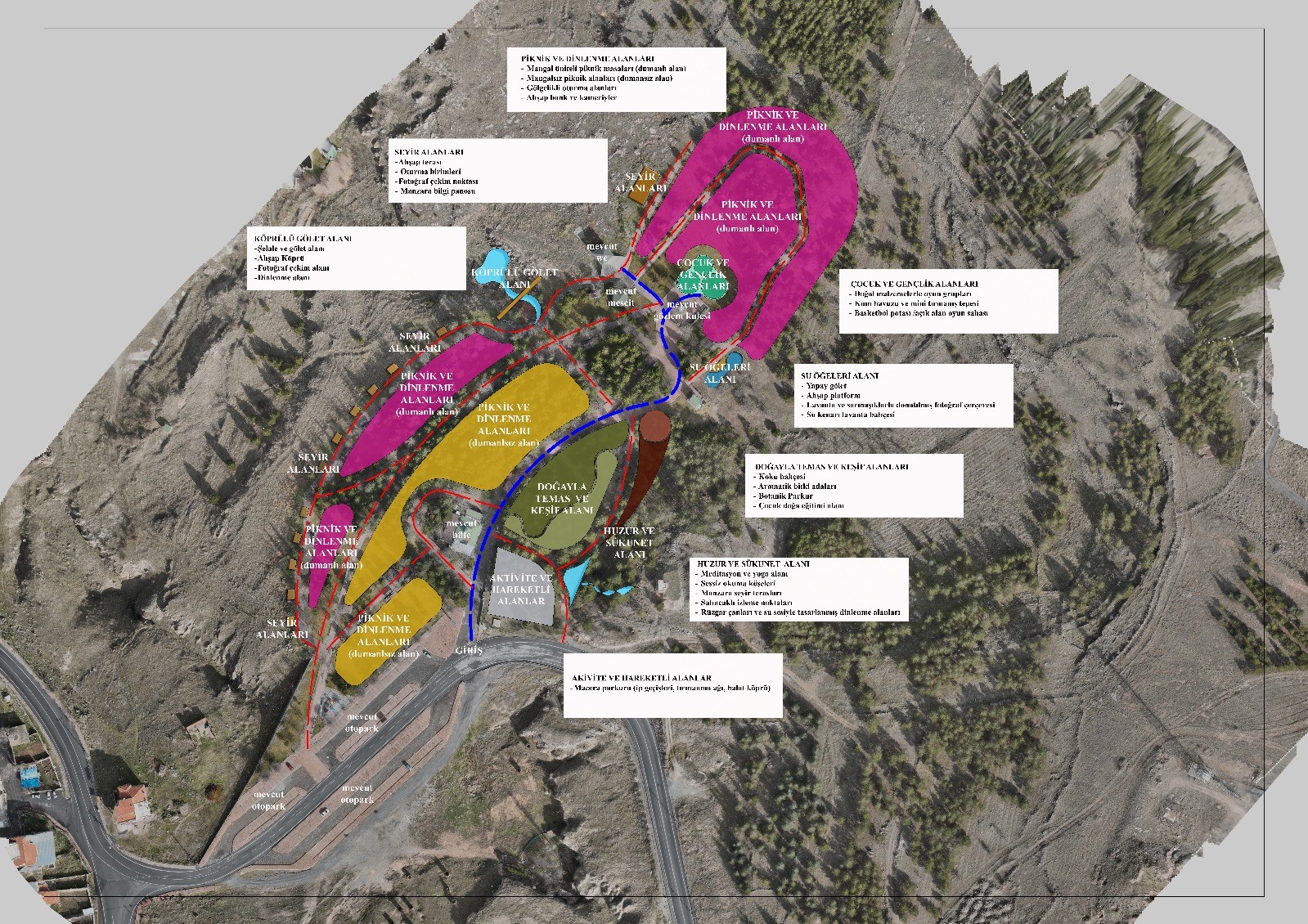 Oyun grupları, doğal malzemelerle oyun grupları, kum havuzu ve mini tırmanış tepesi, açık oyun sahası, meditasyon ve yoga alanı, sessiz okuma köşeleri, manzara seyir terasları, salıncaklı izleme noktaları, rüzgar çanları ve su sesiyle tasarlanmış dinlenme alanları, koku bahçesi, aromatik bitki adaları, botanik parkur, çocuk doğa eğitimi alanı, yapay gölet, ahşap platform, lavanta ve sarmaşıklarla donatılmış fotoğraf çerçevesi, su kenarı lavanta bahçesi programlamasıyla Gesi Mesire Alanı hem genişleyecek hem de botanik bahçeye dönüşecek.