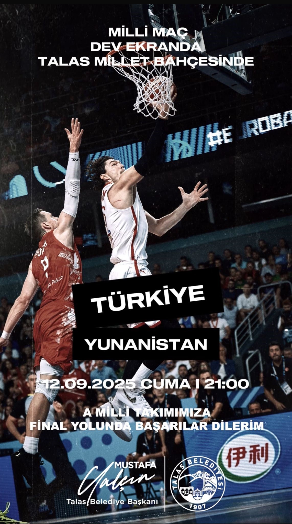 A Milli Basketbol Takımı'nın Avrupa Basketbol Şampiyonası’nda Yunanistan ile bu akşam oynayacağı yarı final maçı, Talas Belediyesi tarafından kurulacak dev ekrandan yayınlanacak.