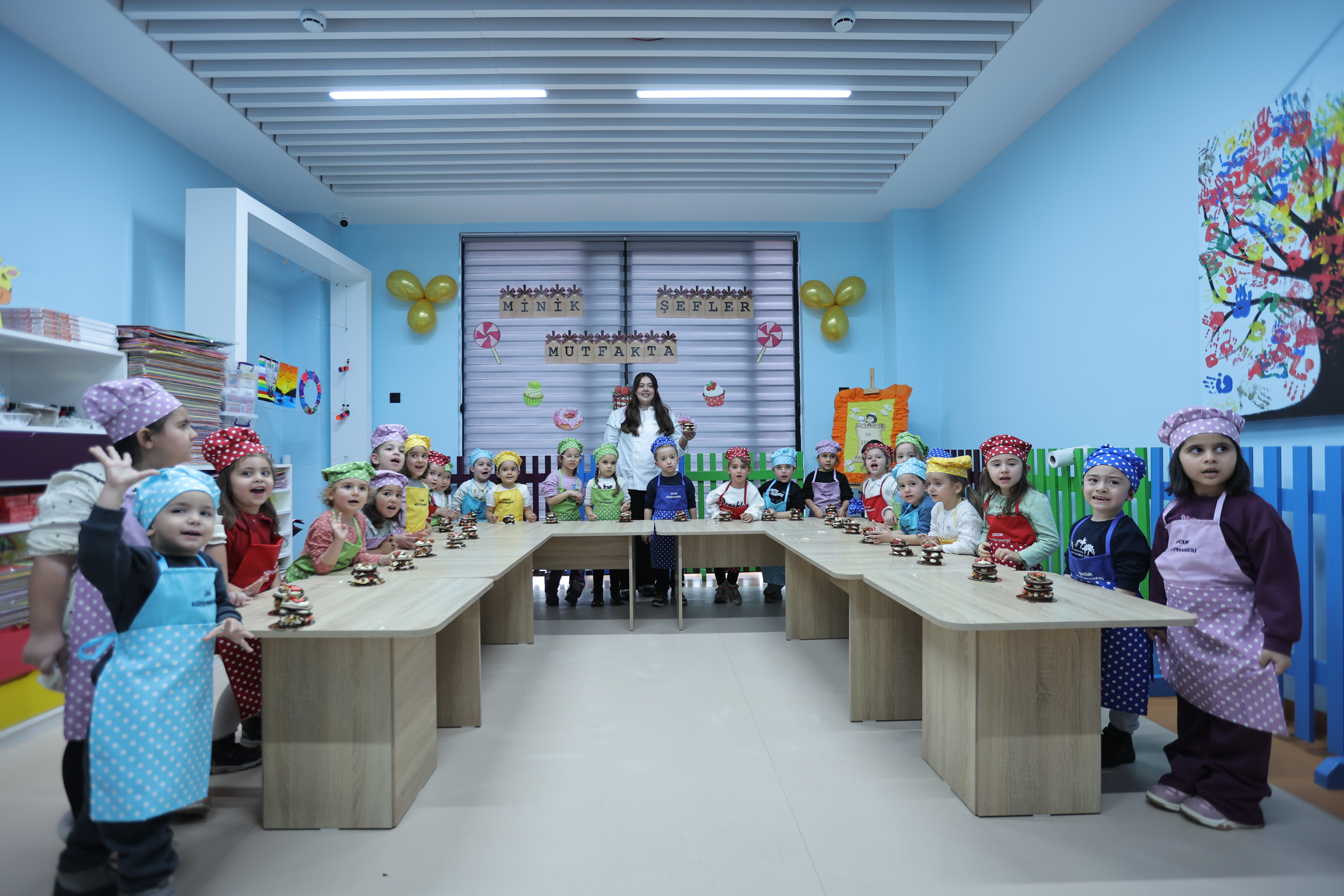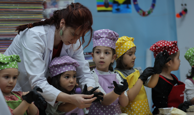 Şef kıyafetlerini giyerek eğlence dolu etkinliğe katılan miniklerin heyecanı ve mutluluğu gözlerinden okundu.