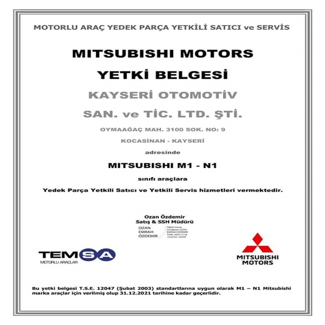 Kayseri Otomotiv Yönetim Kurulu Başkanı ve aynı zamanda Kayseri Oto Sanatkârlar Odası Başkanı da olan Şeyhi Odakır namı diğer Şıkı Usta: “Kayserimizde otomotiv sektörü olarak Mitsubishi marka araçların yedek parça bakım ve serviste bir eksiklik ve boşluk olduğunu tespit ettik. Temsa Mitsubishi firma yetkilileri ile yapmış olduğumuz görüşmede Kayseri’de bu işi bizim yapabileceğimizi ve bu eksikliği giderebileceğimizi ilettik. Yetkililerinde olumlu görüş belirtmesi sonucu 01 Ocak 2021 tarihinden itibaren ilimizde Temsa Mitsubishi yedek parça ve servis olarak hizmet vermeye başladık. Servisimizde Mitsubishi marka midibüs, minibüs ve çift kabin araçların yedek parçası ve servis bakımı yapılacaktır” diyerek müjdeyi verdi.