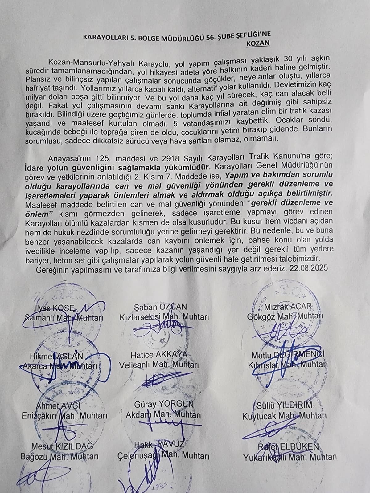 Salmanlı Mahalle Muhtarı İlyas Köse, "Yolumuzda 35 yıldır devam eden bir çalışma var. Yetkililere sorduğumuzda bir cevap alamıyoruz. 5 kişiyi kaybettik, ondan önce de birçok kaza oldu. 5 kişi ölünce sesimiz duyuldu. 35 yıldır bitmeyen bir yol hikâyesi var. Şu an yolun 41 kilometresi belirsiz durumda. 120 kilometrelik yolun yalnızca 40 kilometresi yapıldı. Geri kalan bölüm eski, bariyer yok. 5 kişi öldükten sonra levhalar dikildi. Bu yol çok önemli. Mersin ve Adana limanlarından Kayseri'ye, İç Anadolu'ya bağlanan ticari bir güzergâh" diye konuştu.