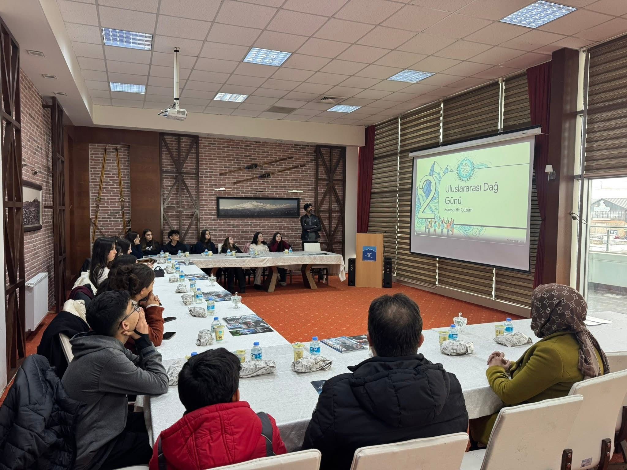 4’üncüsü bu yıl düzenlenen etkinliğin konukları Kilim Sosyal Bilimler Lisesi Çevre Kulübü öğrencileri oldu. Erciyes Tekir Kapı bölgesinde, Erciyes A.Ş. toplantı salonunda, ‘Buzullar, dağlarda ve ötesinde su, gıda ve geçim kaynakları için önemlidir’ mottosuyla düzenlenen etkinliğe Kilim Sosyal Bilimler Lisesi Çevre Kulübü öğrencileri katıldı. Her yıl 11 Aralık’ta, dağların insanlık için taşıdığı hayati önemi hatırlatmak ve farkındalık oluşturmak amacıyla kutlanan Uluslararası Dağ Günü, dağların ve dağ ekosistemlerinin korunmasına dikkat çekiyor. Kayseri Büyükşehir Belediyesi Erciyes A.Ş.’nin dördüncüsünü bu yıl düzenlediği Uluslararası Dağlar Günü etkinliğinde, Kilim Sosyal Bilimler Lisesi Çevre Kulübü öğrencilerine, Erciyes ve günün önemine dair bilgiler aktarıldı.
