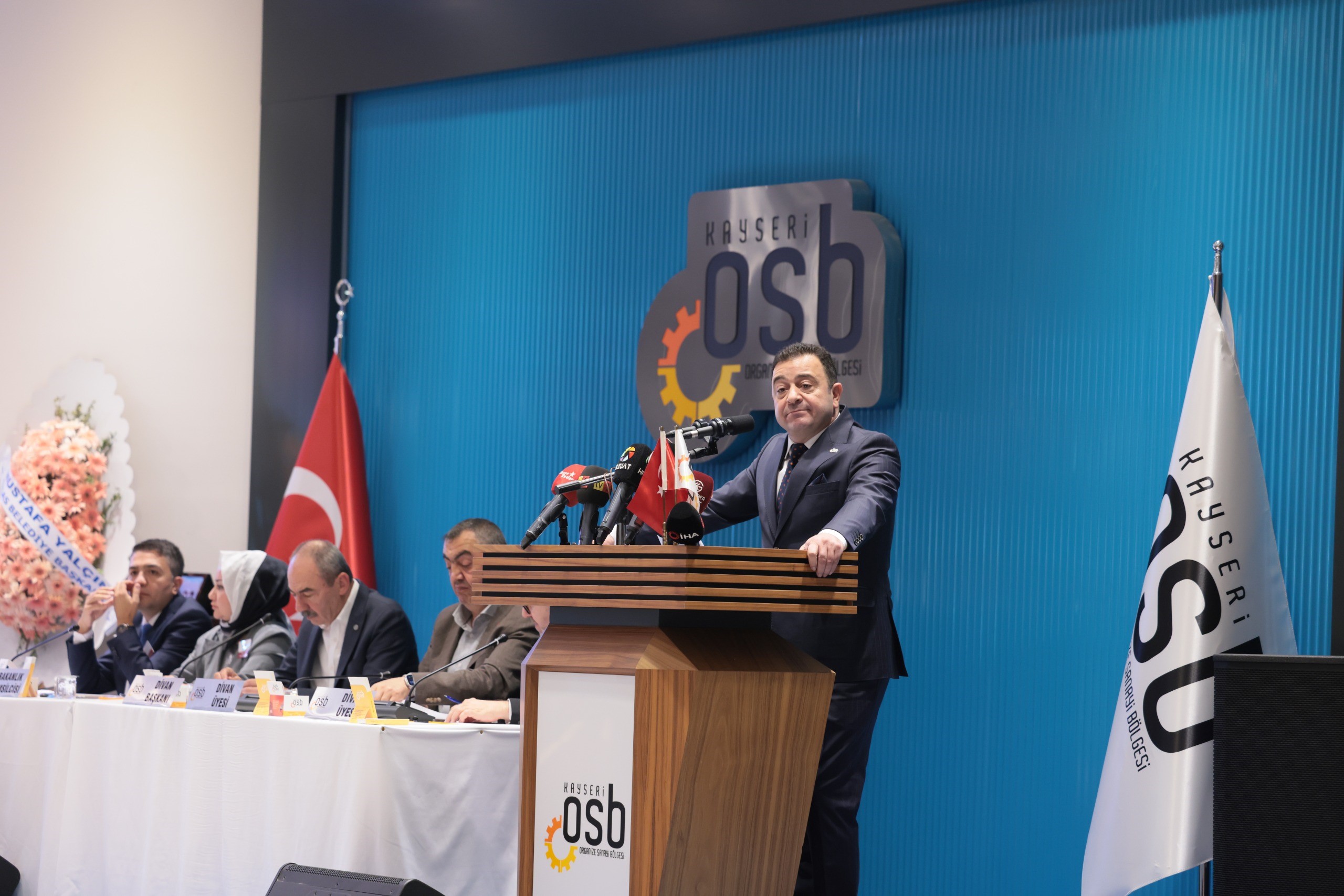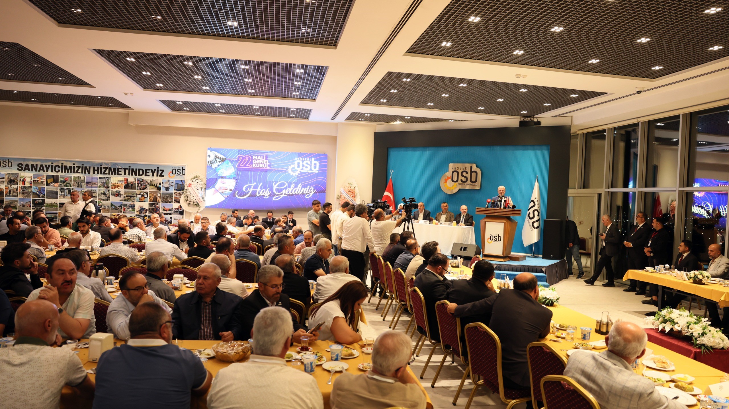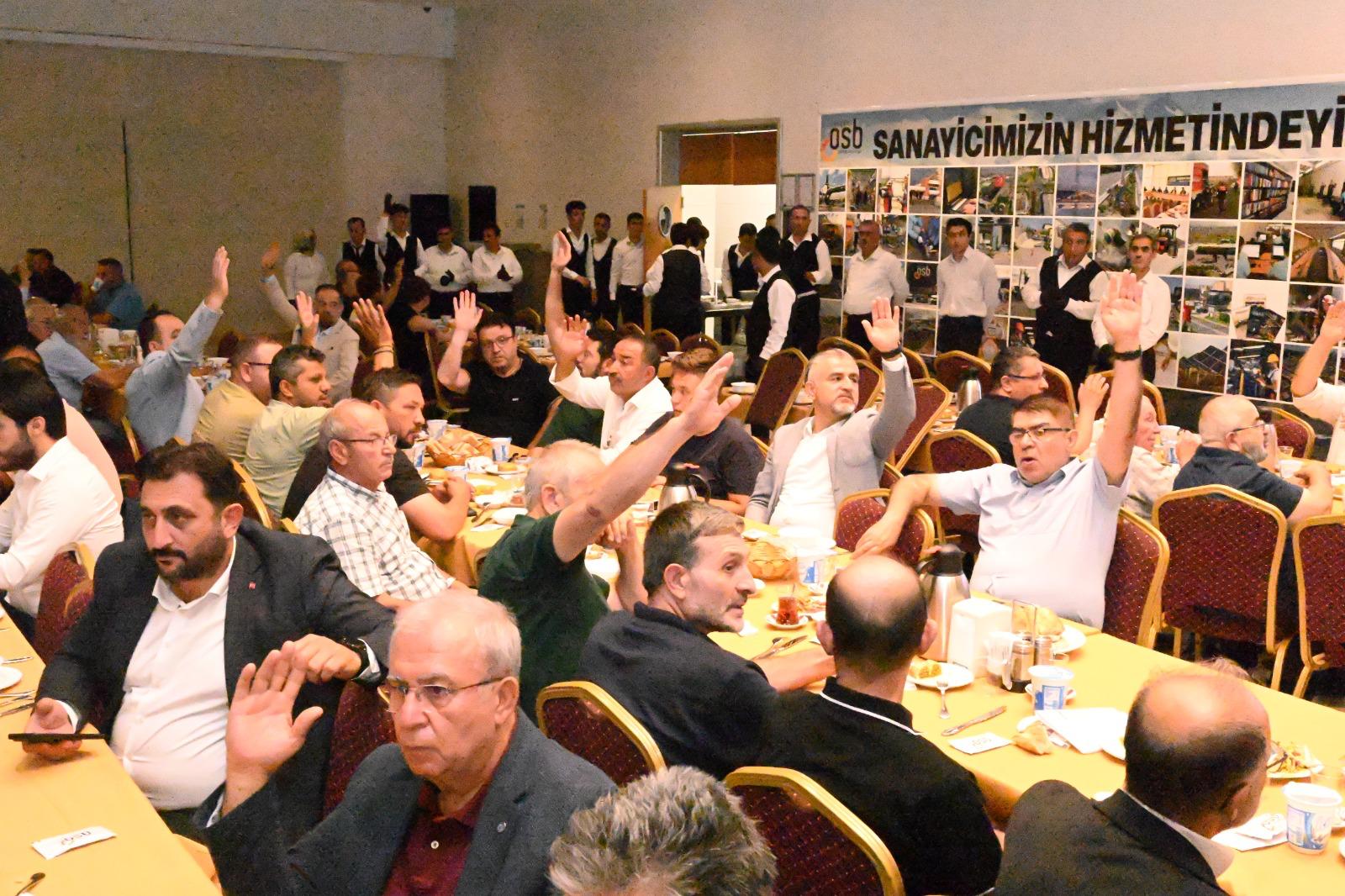 Saygı duruşunda bulunulması ve İstiklal Marşı'nın okunmasının ardından başlayan genel kurulda açılış konuşmasını yapan Kayseri OSB Başkanı Mehmet Yalçın, geride bıraktıkları 3 yılda yaptıkları projeleri sanayicilerle paylaşarak, "2022 yılı Haziran ayından bugüne daima sanayicilerimizin ihtiyaçlarını ve taleplerini karşılamak için elimizden gelen bütün gayreti gösterdik. Sanayicimizi desteklemek, sıkıntıları çözebilmek için oluşturduğumuz çok sayıda projemizi tek tek hayata geçirmiş bulunmaktayız. Sağlık merkezimizi tamamladık. 2 adet eczane işyerimizi hazır hale getirdik. Yeni iş merkezimizin inşaatında yüzde 70 seviyesine ulaştık. Bugüne kadar 60 kilometrelik yolumuzu asfaltladık. Hedefimiz 85 kilometre toplam asfalt yol ağımızın tamamını yenilemektir. Güvenlik konusunda önemli adımlar attık. Polisimiz akşam 7'den sabah 7'ye kadar Bölgemizdeki devriyesini sürdürmektedir. Üç ana nizamiyemizi tamamladık. Dördüncü nizamiyemizin de yakın zamanda temelini atacağız. Yağmur suyu terfi hattı kapasitemizi iki katına çıkardık. Araç filomuzu yeniledik, 21 yeni aracı sanayicilerimizin hizmetine kazandırdık. Sadece üretime yönelik değil, eğitime ve insan kaynağına yönelik çalışmalarda yapmaktayız. Teknik Kolejimiz başarıyla faaliyetlerine devam etmektedir. Kayseri OSB Meslek Yüksekokulumuz bu yıl ilk mezunlarını vermiştir. Nitelikli iş gücü ihtiyacını karşılamaya yönelik açtığımız kurslarımızla sanayicimizi desteklemeyi sürdürmekteyiz. Kayseri Üniversitesi Teknik Bilimler Fakültesi ve Kayseri OSB MYO için yeni binaların yapımıyla ilgili çabalarımız sürmektedir. Bilişim altyapımızı yenileyerek dijital, şeffaf bir yapıya geçiş yaptık. E-OSB projemizi devreye aldık, tanıtım süreçlerini başlattık. Sanayicilerimizi bilişim alanında ileriye taşıyacak olan DATA-CENTER projesine start verdik. Sanayicilerimizin verileri bulut sistemi ile OSB tarafından korunacaktır. 100 megavatlık GES projemiz için gerekli altyapı hazırladık. Çok kısa zamanda TEİAŞ'tan izni alarak, sanayicimizin hizmetine sunacağız. Yaklaşık 250 kilometre kablo montajını tamamladık. Yeni trafo binamız DM-6'yı Bölgemize kazandırdık. Enerji verimliliği kapsamında yüzde 70 daha az enerji tüketen 2.000 adet armatürün değişimine başladık. Atık su arıtma tesisimizin mekanik alt yapısını yeniledik. Az enerji ile çok iş yaptık, arıtma kapasitemizin verimliliğini artırdık" diye konuştu.