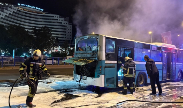 Kayseri'nin Melikgazi ilçesinde özel halk otobüsü kırmızı ışıkta beklediği sırada motor kısmından alev alırken, polis ekiplerinin müdahalesi yangının büyümesini engelledi.