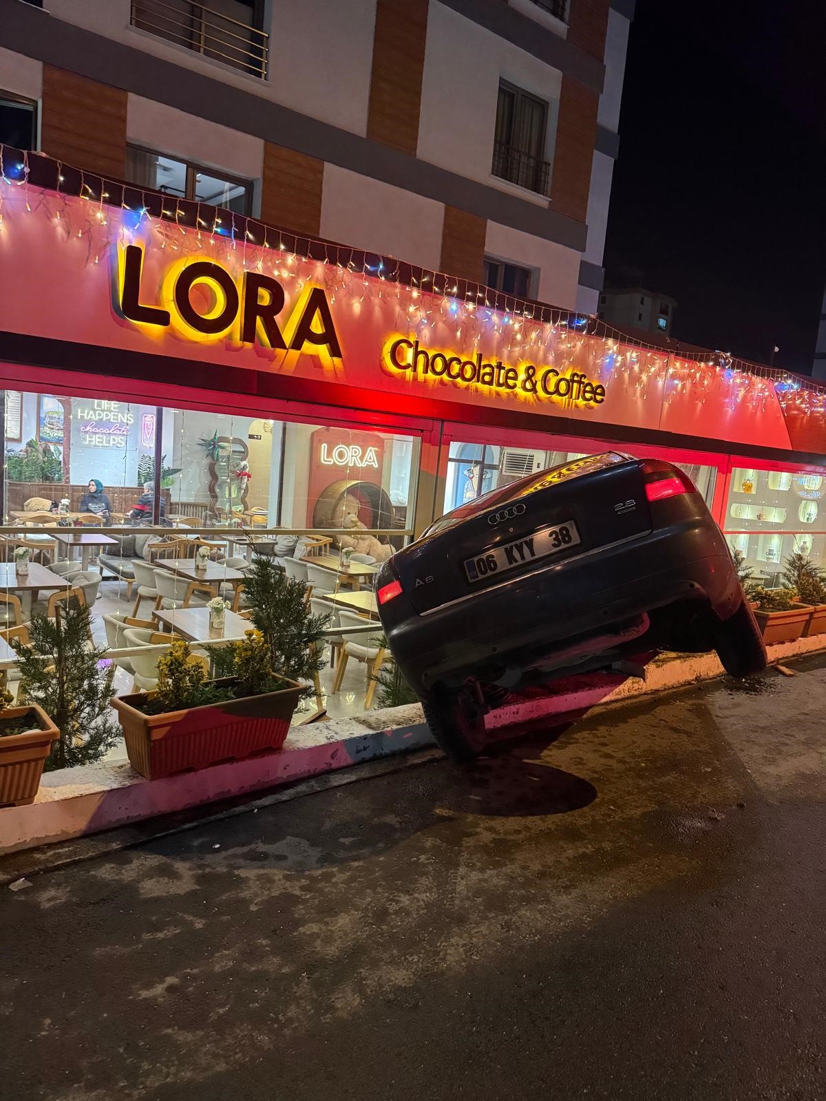 Öte yandan, otomobil kafeteryaya girmeden saniyeler önce 2 kişinin aracın girdiği bölümdeki masaya oturmak üzere olduğu ve kazayı saniyelerle atlattıkları anlar güvenlik kamerasına yansıdı.