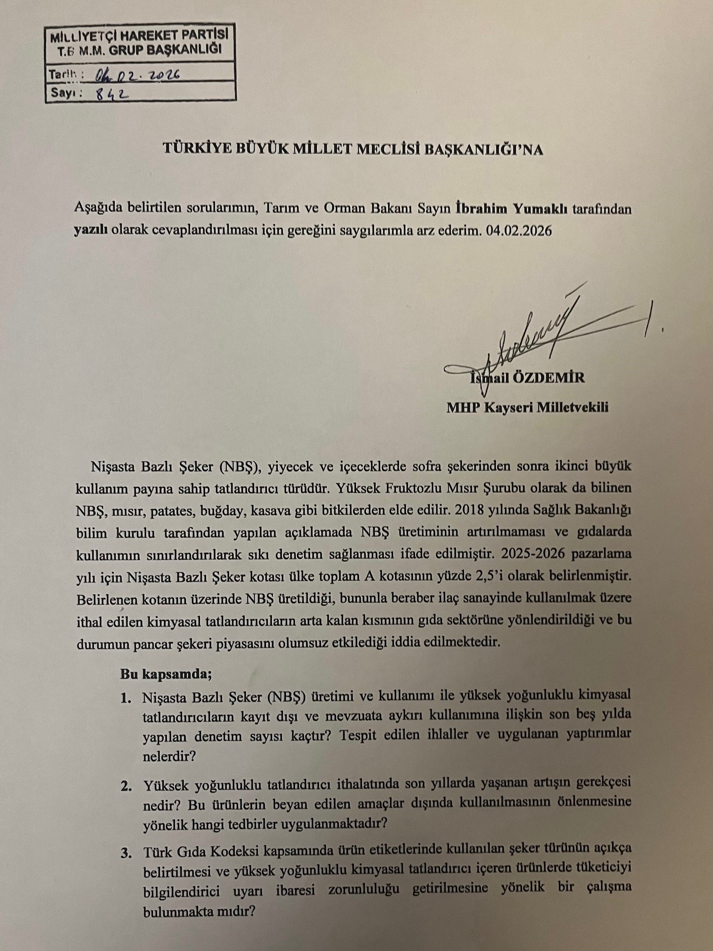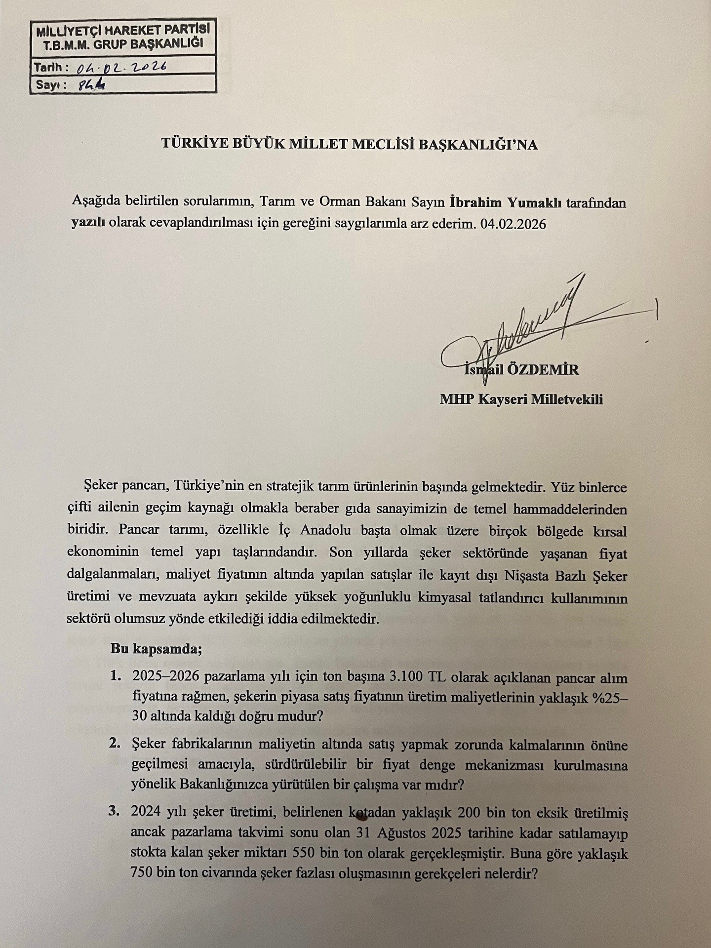 Milliyetçi Hareket Partisi (MHP) Genel Başkan Yardımcısı ve Kayseri Milletvekili İsmail Özdemir, Türkiye Büyük Millet Meclisi’ne (TBMM) şeker fabrikalarının pancar ve şeker üretimiyle ilgili yaşadığı sorunlarla ilgili soru önergesi verdi.