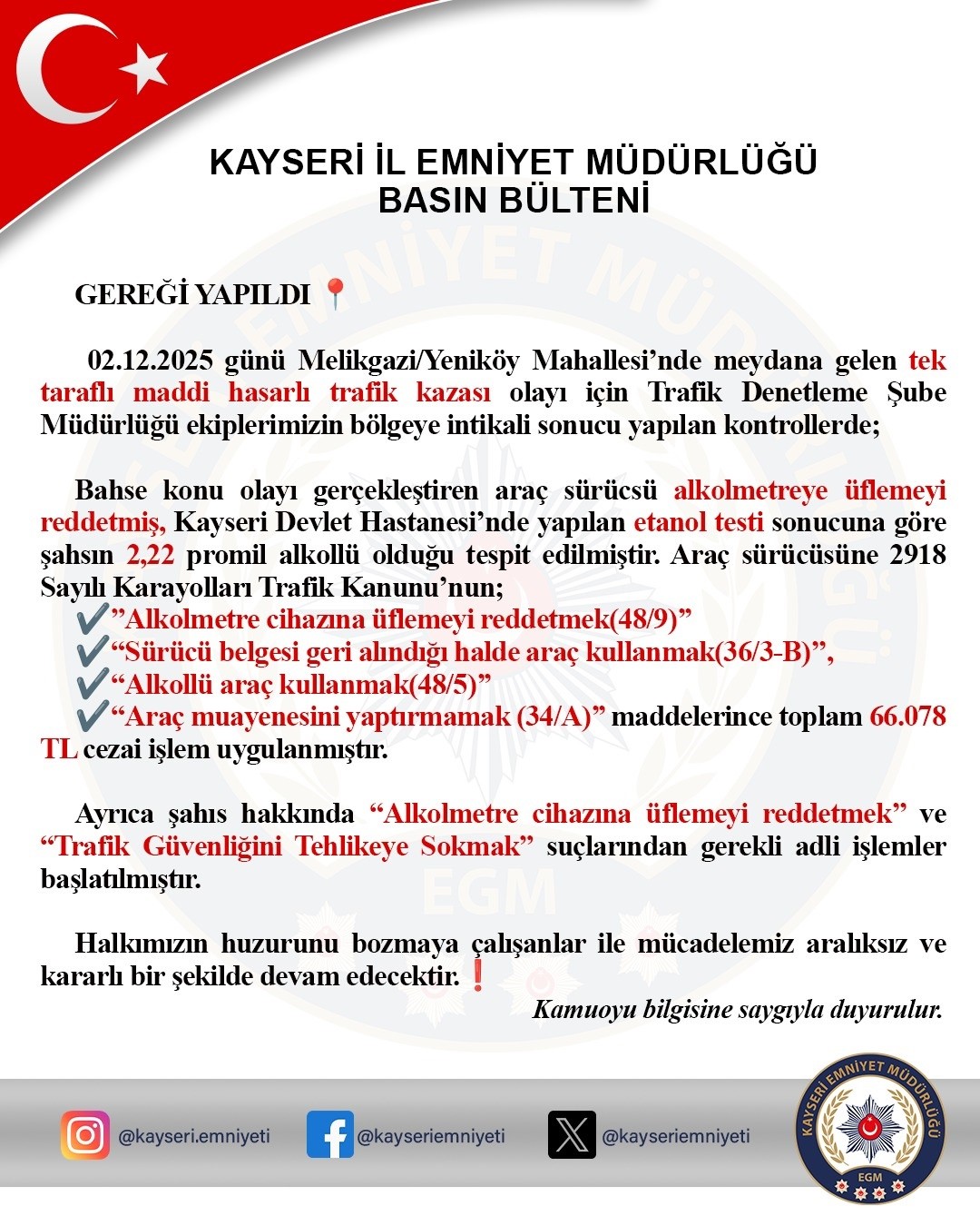 Sürücünün Kayseri Devlet Hastanesi'nde yapılan etanol testi sonucuna göre şahsın 2,22 promil alkollü olduğu tespit edilirken, alkolmetre cihazına üflemeyi reddetmek, sürücü belgesi geri alındığı halde araç kullanmak, alkollü araç kullanmak ve araç muayenesini yaptırmamak maddelerinden toplam 66 bin 78 TL cezai işlem uygulandı. Ayrıca sürücü hakkında alkolmetre cihazına üflemeyi reddetmek ve trafik güvenliğini tehlikeye sokmak suçundan da adli işlem başlatıldı.