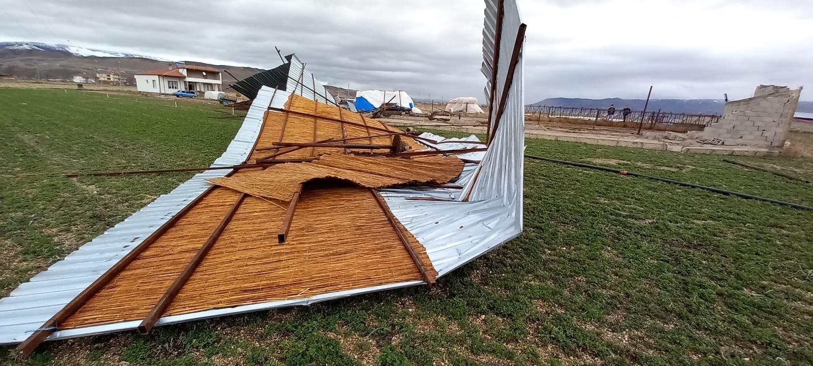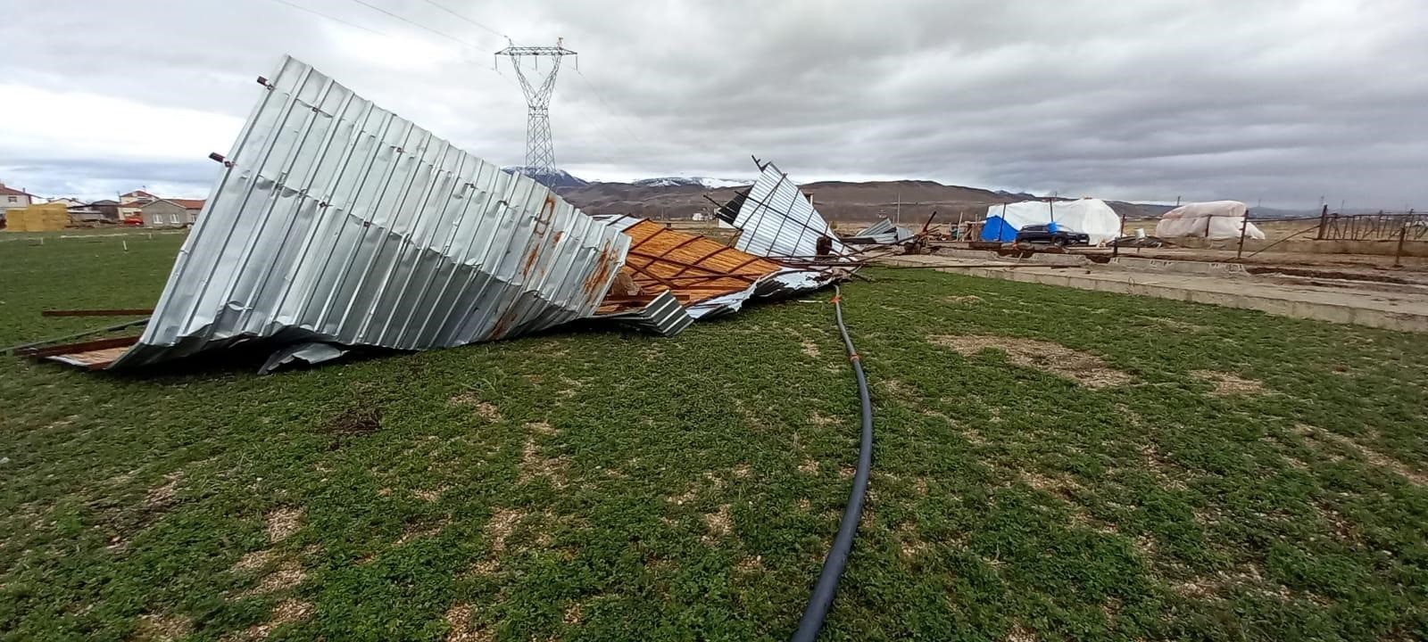 Kayseri’nin Develi ilçesinde etkili olan şiddetli rüzgar bir ahırın çatısını uçurdu.