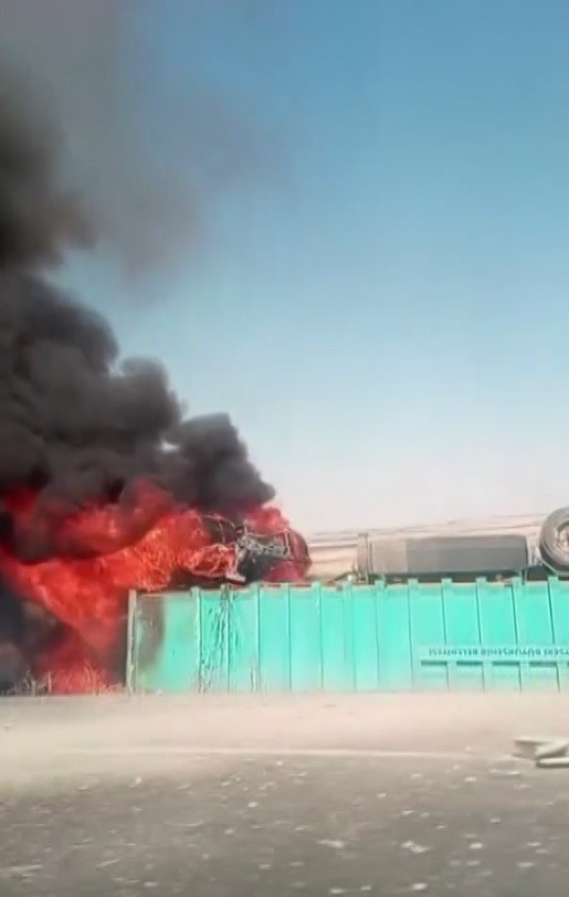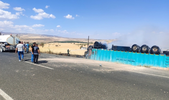 Kayseri'nin Bünyan ilçesinde bir şoför, devrildikten sonra yanan tırdan atlayarak kurtuldu.