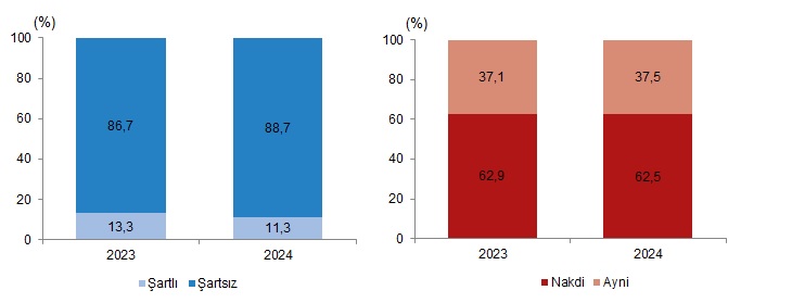 Sosyal koruma yardımlarının yüzde 11,3’ü şartlı olarak verildiŞartlı yardımlar içinde en büyük payı yüzde 51,2 ile aile/çocuk yardımları oluşturdu. Bunu yüzde 19,3 ile engelli/malul yardımları ve yüzde 12,3 ile hastalık/sağlık bakımı yardımları takip etti.Sosyal koruma yardımlarının yüzde 62,5’i nakdi olarak verildiNakdi yardımlarda en büyük payı yüzde 74,2 ile emekli/yaşlılara yapılan yardımlar oluşturdu. Bunu yüzde 16,1 ile dul/yetim yardımları ve yüzde 4,1 ile aile/çocuk yardımları takip etti.Türlerine göre sosyal koruma yardımları (%), 2023, 2024
