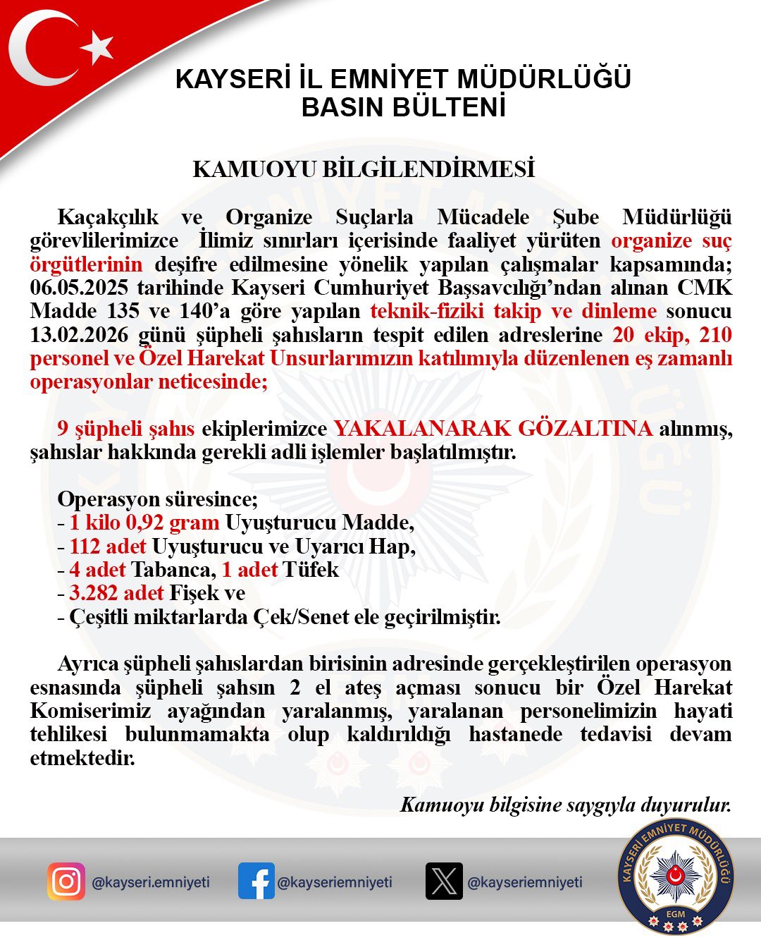 Edinilen bilgiye göre Kaçakçılık ve Organize Suçlarla Mücadele Şube Müdürlüğü görevlilerince il sınırları içerisinde faaliyet yürüten organize suç örgütlerinin deşifre edilmesine yönelik çalışma yapıldı. Yürütülen teknik, fiziki takip ve dinleme sonucu şüpheli şahısların tespit edilen adreslerine eş zamanlı operasyon düzenlendi. 20 ekip, 210 personel ve özel harekat polislerinin katılımıyla düzenlenen operasyonlar neticesinde 9 şüpheli şahıs yakalanarak gözaltına alındı. Operasyonda 1 kilo 0,92 gram uyuşturucu madde, 112 adet uyuşturucu ve uyarıcı hap, 4 adet tabanca, 1 adet tüfek, 3 bin 282 adet fişek ve çeşitli miktarlarda çek/senet ele geçirildi.