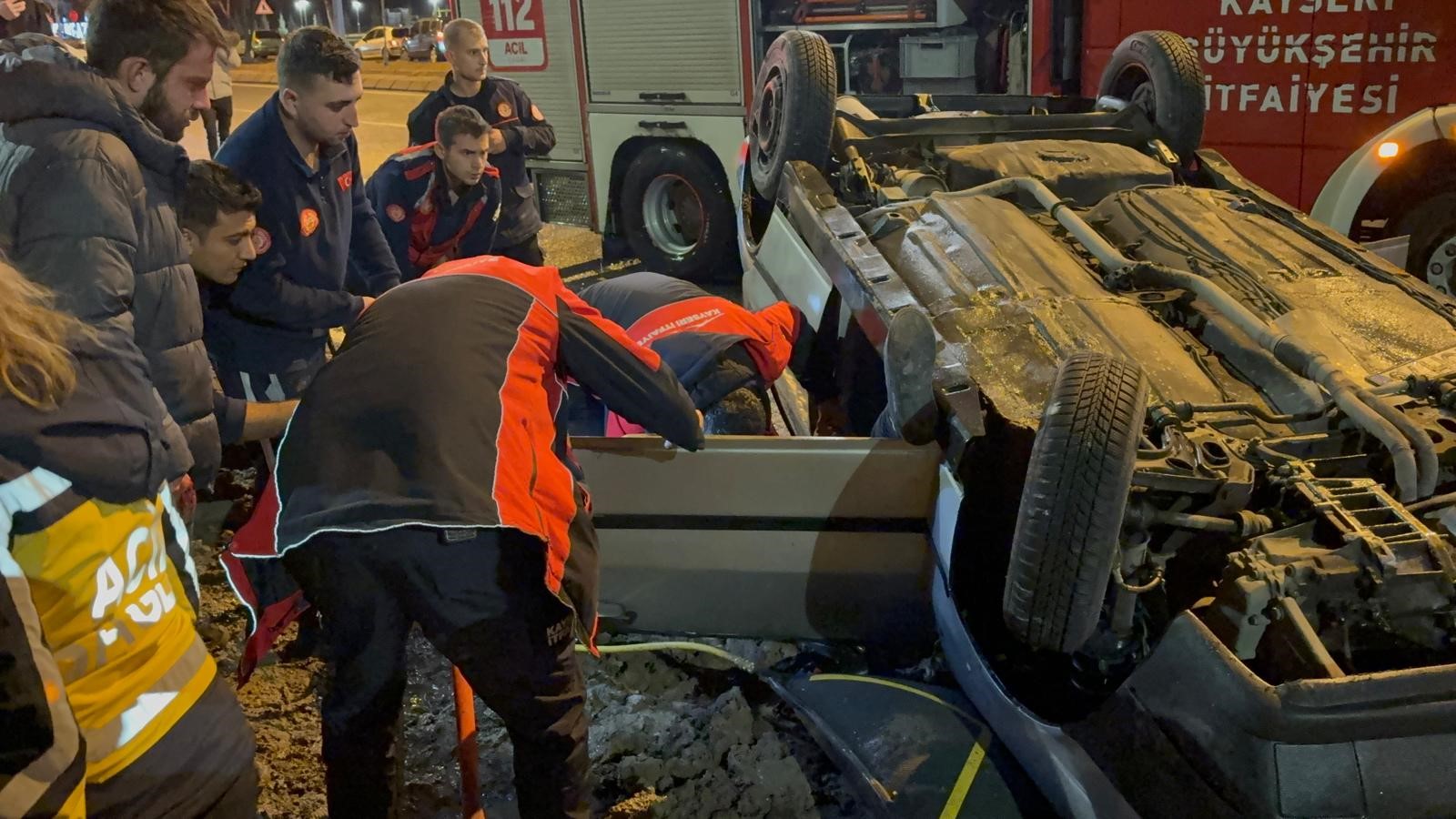 Kayseri’nin Melikgazi ilçesinde kontrolü kaybolan otomobil yolun karşısına geçerek, takla attı. Kazada sürücü otomobilde sıkışırken, kendi imkanıyla otomobilden çıkan yaralı yolcu arkadaşı kurtarılana kadar başından ayrılmadı.