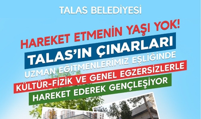 Talas Belediyesi, sağlıklı ve aktif yaşam anlayışını her yaş grubuna yaymak amacıyla örnek bir projeyi daha hayata geçiriyor. ‘Hareket Etmenin Yaşı Yok’ sloganıyla düzenlenen ‘Talas’ın Çınarları’ programı, ileri yaş gruplarına yönelik kültür-fizik ve genel egzersizlerle Talaslı büyükleri harekete geçiriyor.
