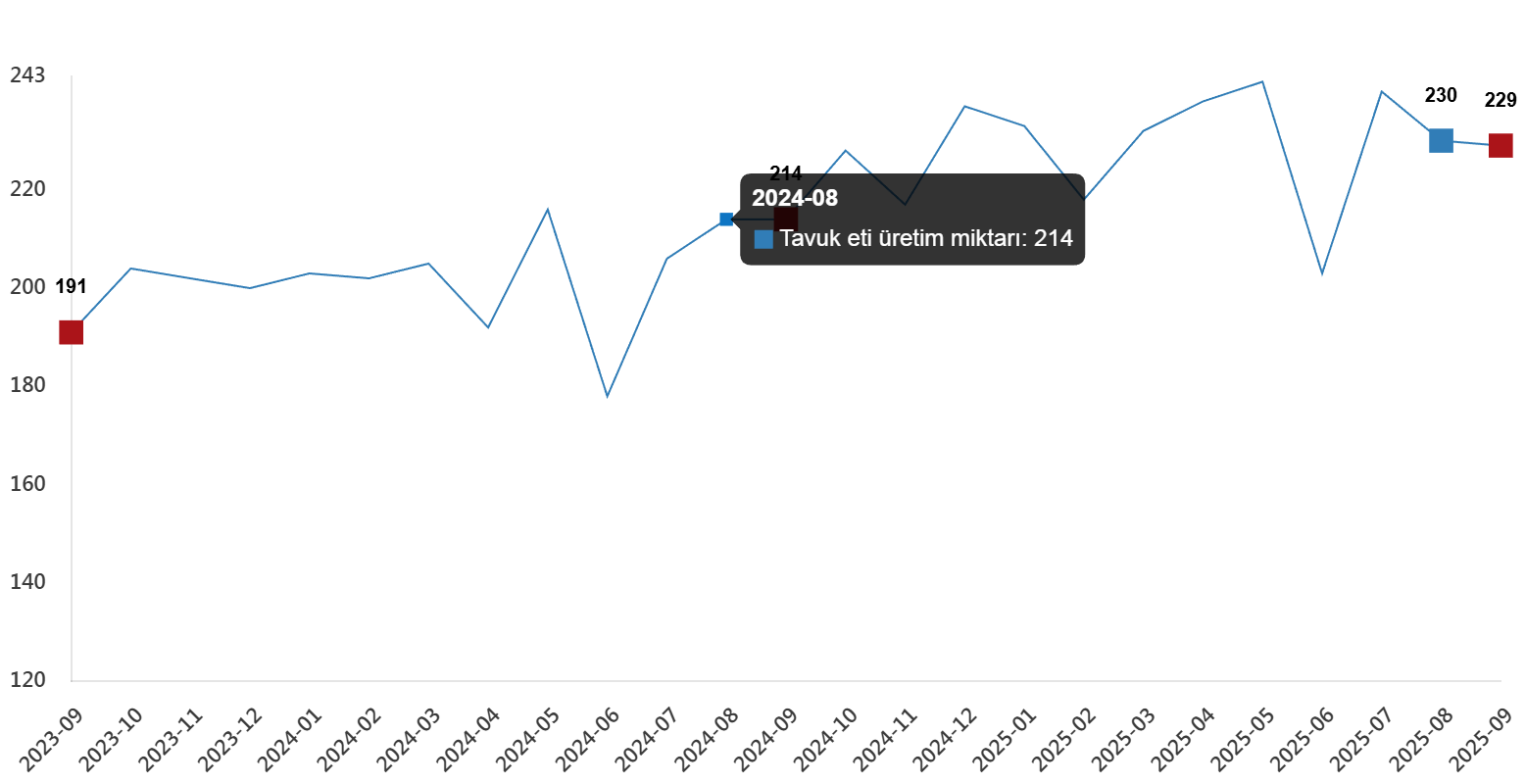 Tablodaki oranlar yuvarlanmış rakamlar üzerinden hesaplanmıştır.Bir önceki ay 229 bin 965 ton olan tavuk eti üretimi Eylül ayında yüzde 0,5 oranında azalarak 228 bin 846 ton oldu.Tavuk eti üretim miktarı, Eylül 2025