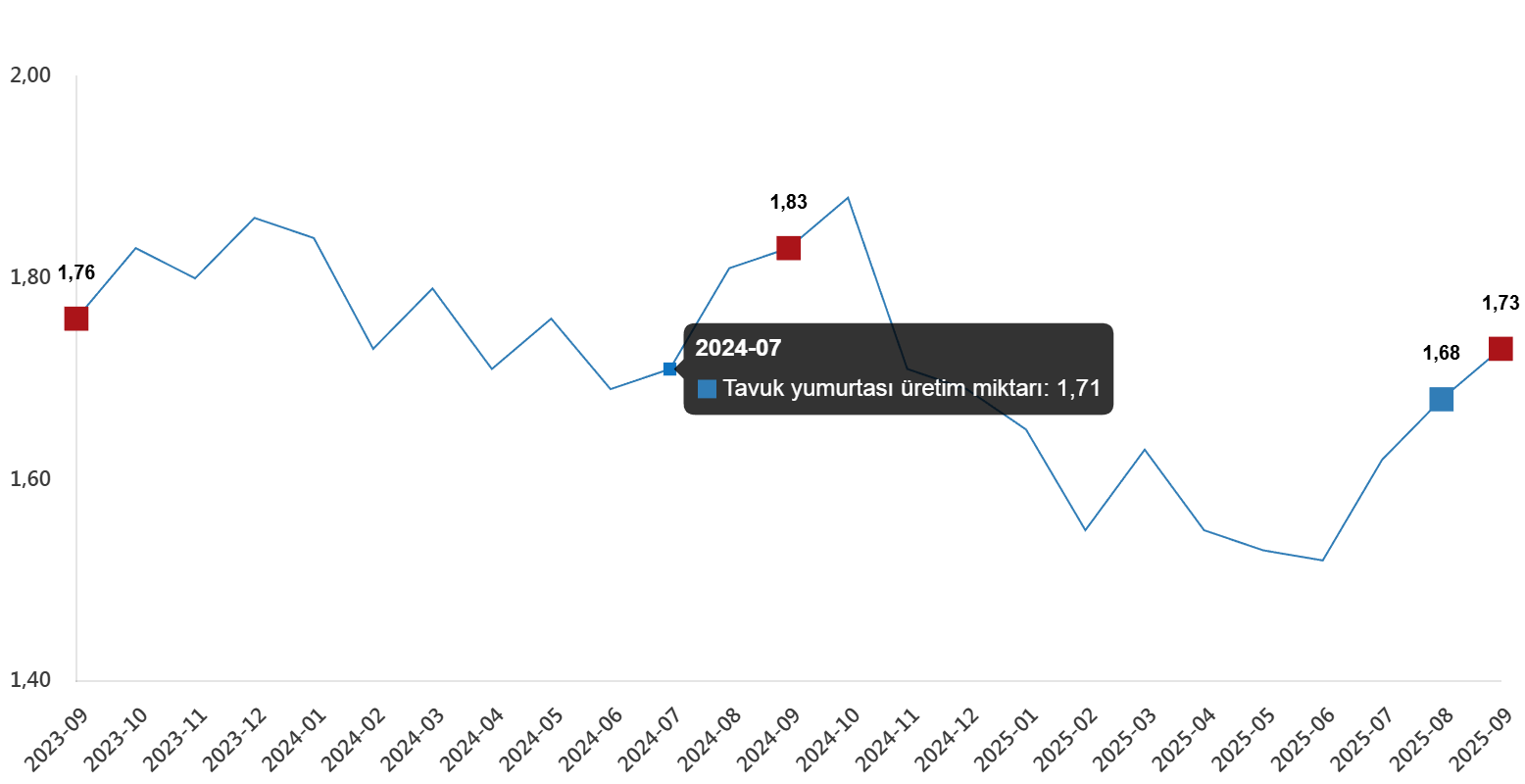 Bir önceki ay 1 milyar 679 milyon 706 bin adet olan tavuk yumurtası üretimi Eylül ayında yüzde 3,1 oranında artarak 1 milyar 731 milyon 478 bin adet oldu.Tavuk yumurtası üretim miktarı, Eylül 2025(Milyar adet)