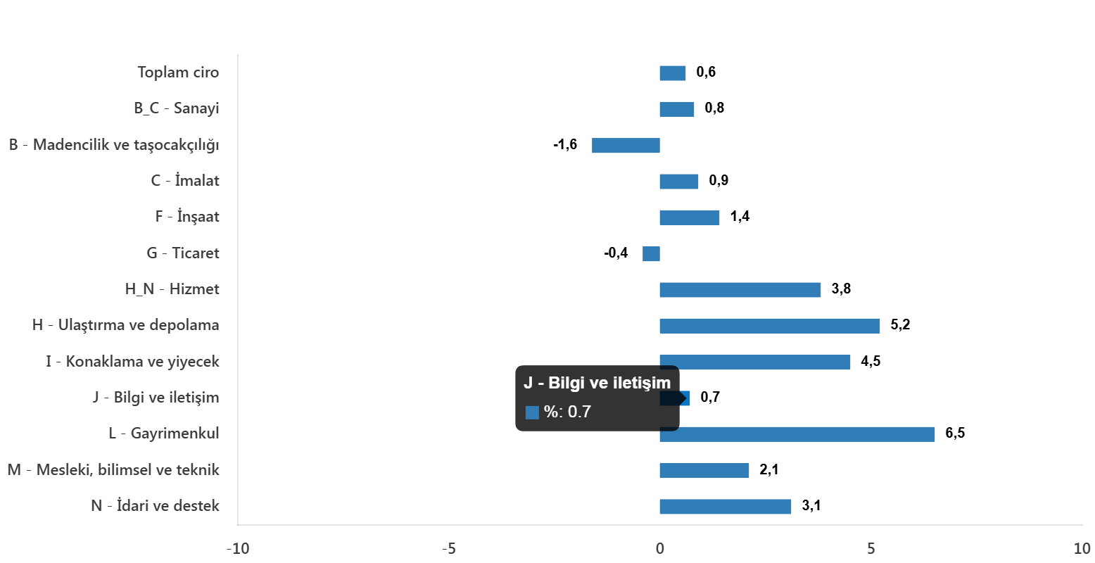 Toplam ciro aylık yüzde 0,6 arttıSanayi, inşaat, ticaret ve hizmet sektörleri toplamında ciro endeksi, 2025 yılı Ekim ayında aylık yüzde 0,6 arttı.Toplam cironun alt detaylarına bakıldığında; 2025 yılı Ekim ayında aylık sanayi sektörü ciro endeksi %0,8 arttı, inşaat ciro endeksi %1,4 arttı, ticaret ciro endeksi %0,4 azaldı, hizmet ciro endeksi %3,8 arttı.Toplam ciro aylık değişim oranı(%), Ekim 2025