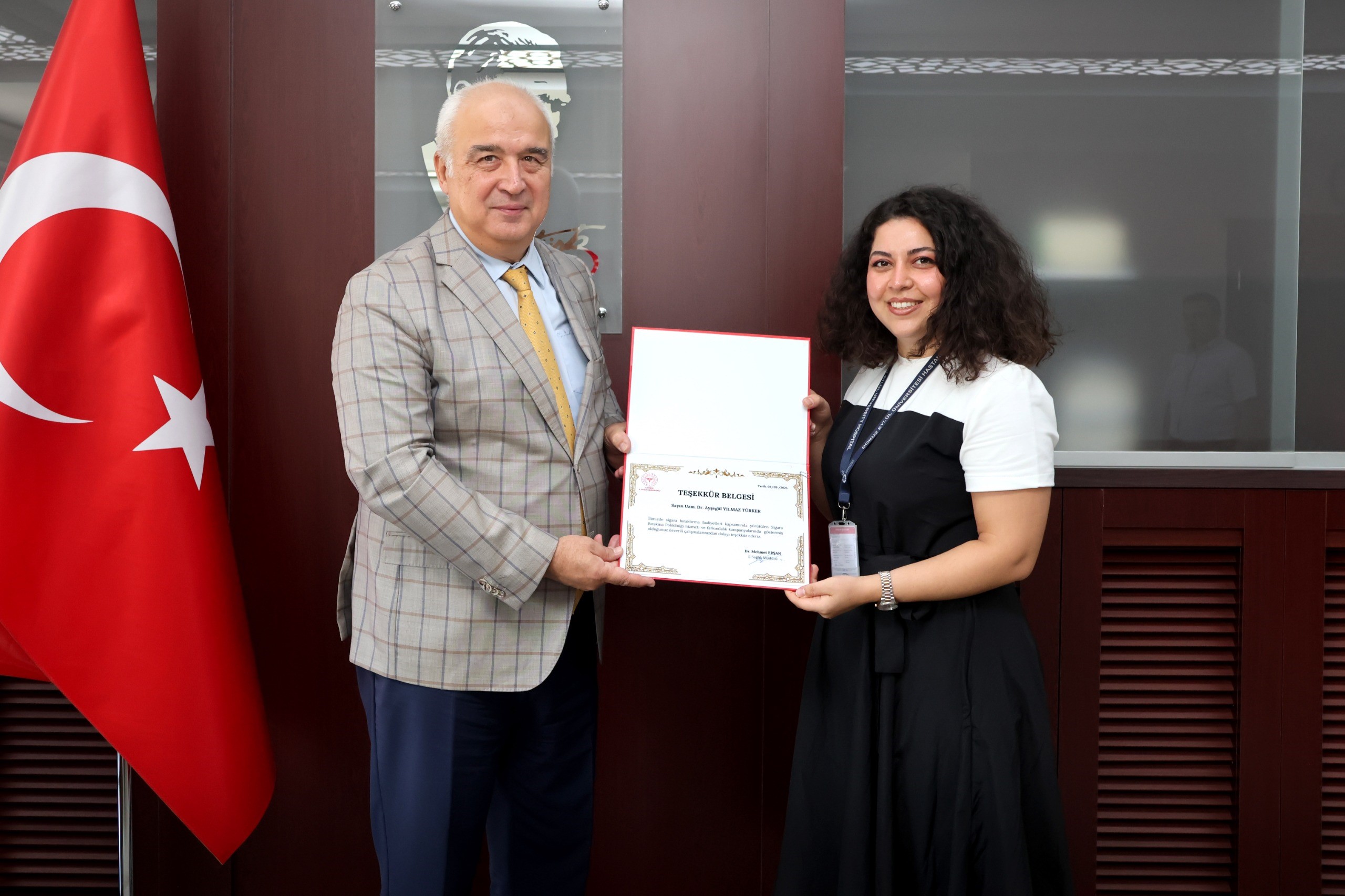 3-9 Eylül Halk Sağlığı Haftası’nda sağlıklı yaşamın teşvik edilmesi ve zararlı alışkanlıklara dikkat çekilmesi hedefleniyor. Bu kapsamda, Kayseri’de en çok başvuru alan sigara bırakma polikliniği hekimlerinden Uzm. Dr. Ayşegül Yılmaz Türker’e başarılı çalışmaları nedeniyle Melikgazi Kaymakamı Sedat Sırrı Arısoy tarafından teşekkür belgesi verildi.
