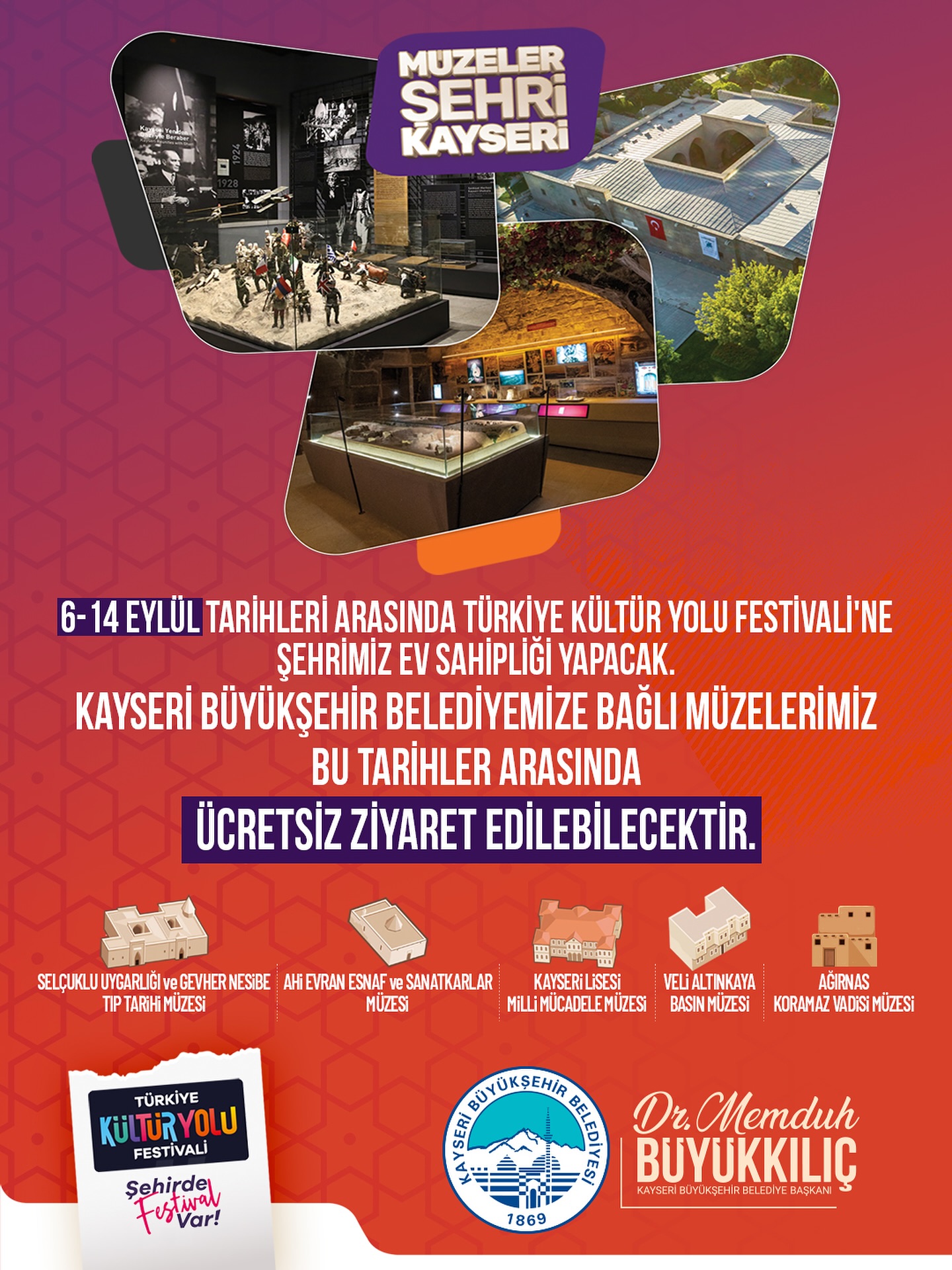 Festival coşkusunu herkesin yaşaması için Büyükşehir Belediyesi, bünyesindeki tüm müzelerinin kapılarını ziyaretçilerine ücretsiz olarak açtı. Kayseri Büyükşehir Belediye’sinin tüm müzeleri 6-14 Eylül tarihleri arasında ücretsiz olarak ziyaretçilerini ağırlayacak.