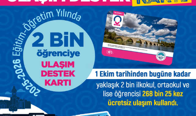 Öğrenci dostu hizmetleri ile gönüllere dokunan ve Cumhurbaşkanı Recep Tayyip Erdoğan’ın elinden genç dostu şehir ödülü alan Başkan Dr. Memduh Büyükkılıç yönetimindeki Kayseri Büyükşehir Belediyesi, öğrenciler için desteklerini her yıl olduğu gibi bu yıl da sürdürüyor. Büyükşehir’in 2025 yılı ulaşım kartı desteğinden 1 Ekim tarihinden bu güne toplam 1982 ilkokul, ortaokul, lise öğrencisi faydalandı. Destekten faydalanan öğrenciler 3 aylık süreçte 268 bin 25 kez ulaşımdan ücretsiz faydalandı.