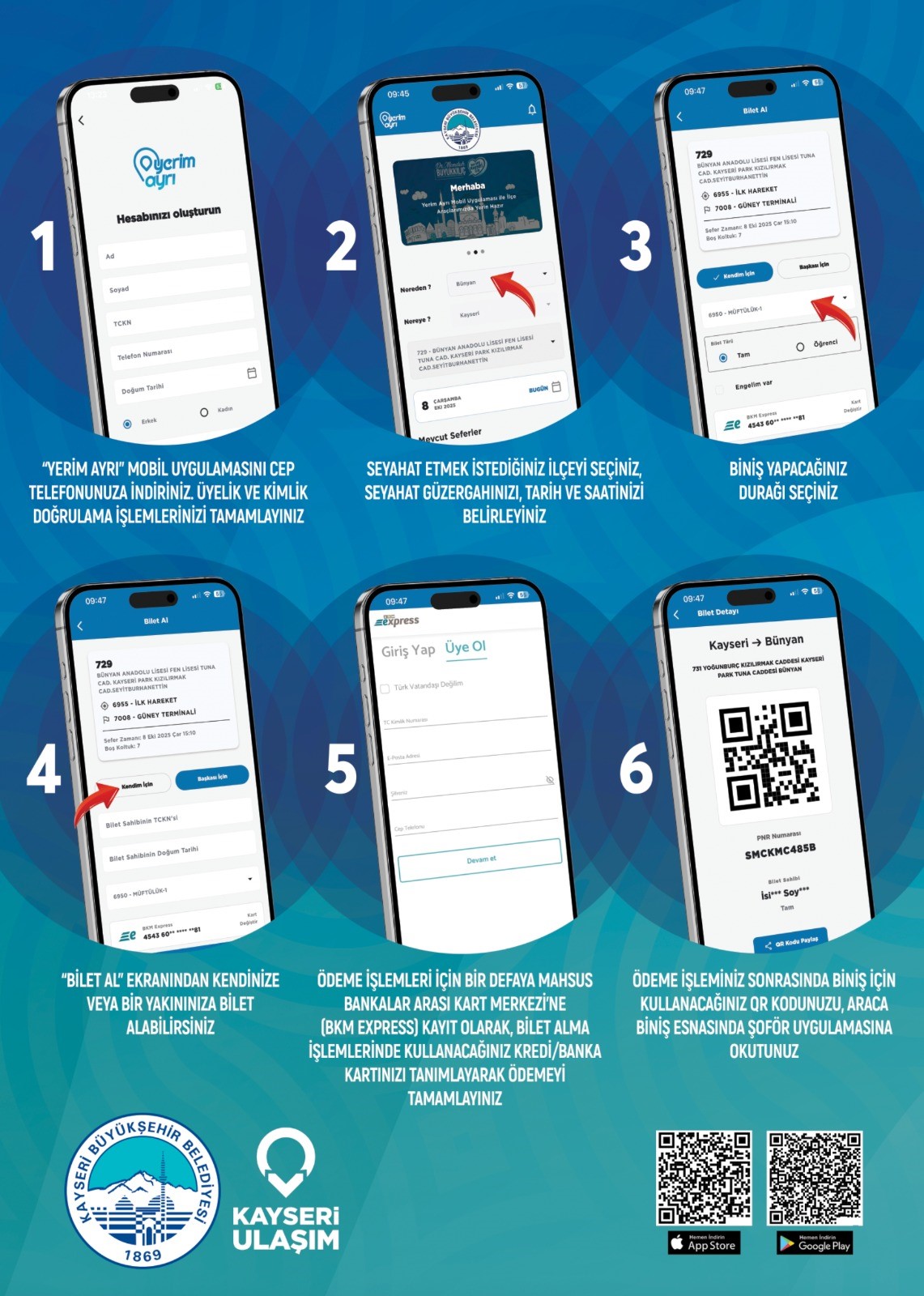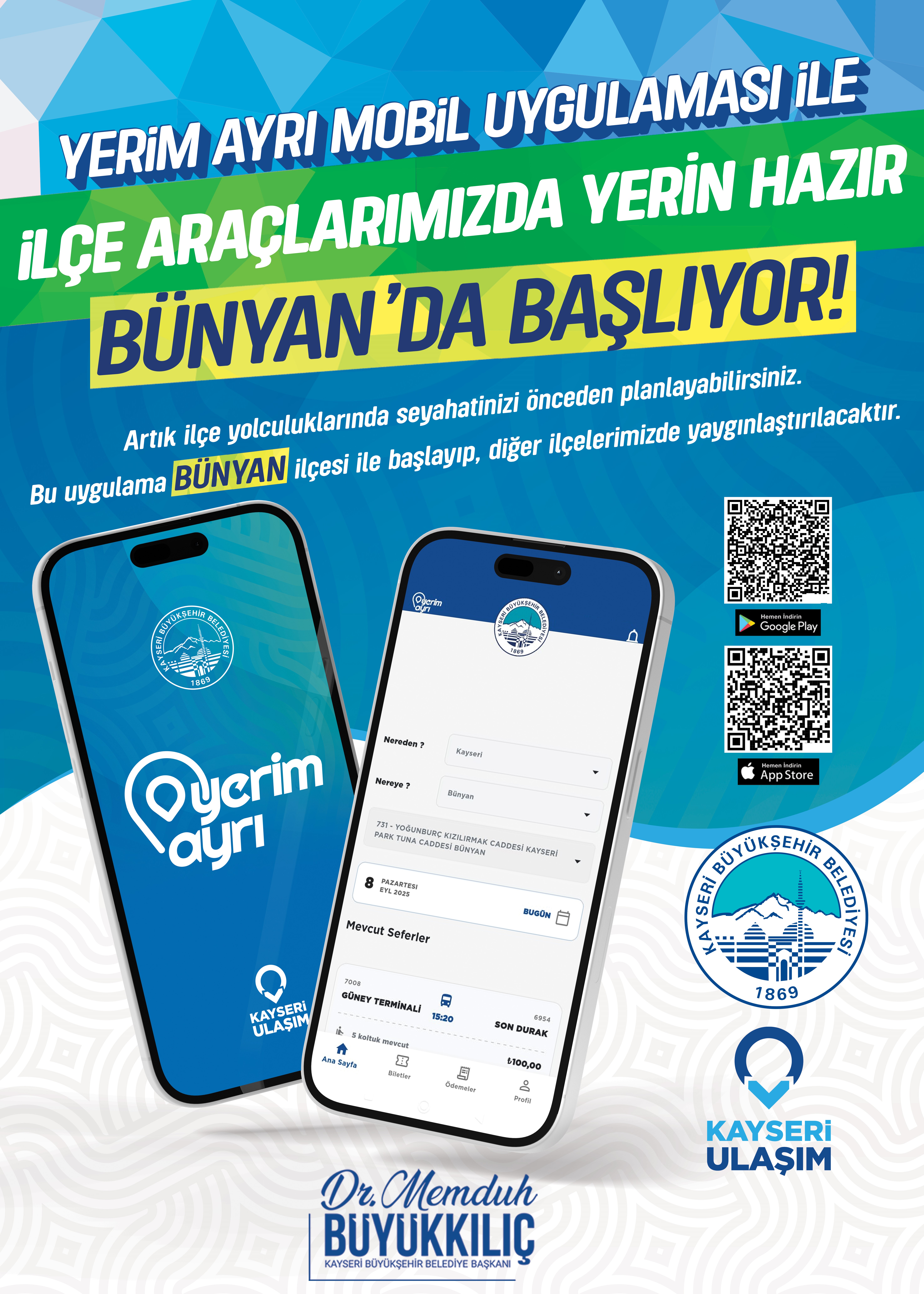 "Kayseri Büyükşehir Belediyesi’nden bir ilk daha. Artık ilçe yolculuklarında seyahatlerinizi önceden planlayabileceksiniz. Kayseri'de Talep Odaklı Ulaşım Uygulaması’nın ilk adımı olacak olan bu projemiz; Kayseri Şehir Merkezi ile İlçeler arasında ulaşım araçlarını kullanan yolcularımız için büyük kolaylık sağlayacak. Kullanıma sunacağımız ‘Yerim Ayrı Mobil Uygulamamız’ ile ilçe seyahatlerinize ait biletlerinizi mobil uygulama üzerinden satın alarak, koltuğunuz yolculuk öncesinde hazır olacak ve kalkış duraklarına gitmenize gerek kalmadan ilgili ilçe hattının güzergâhı üzerindeki tanımlı duraklardan araçlarımıza biniş yapabileceksiniz. Yerim Ayrı Mobil Uygulamamız ilk olarak Bünyan ilçemizde yolcularımızın kullanımına sunulacaktır."