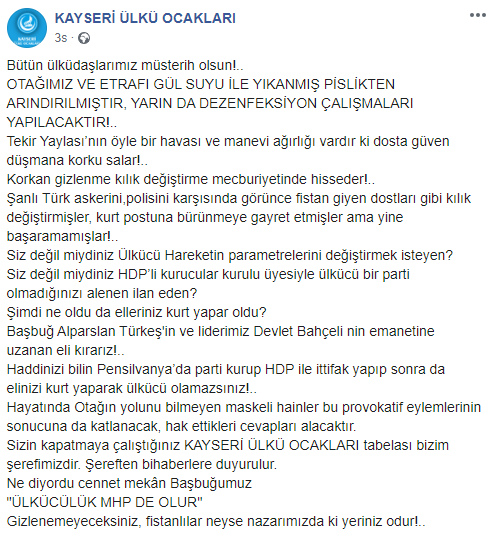 Ülkü Ocakları Kayseri İl Başkanı Ali Çelik ve yönetim kurulu üyeleri Erciyes Tekir Yaylası'nda bulunan Başbuğ Alparslan Türkeş Otağı'nı ziyaret ederek fotoğraf çektirdi. Kayseri Ülkü Ocakları Sosyal medya hesabı üzerinden yapılan paylaşım ile sert tepki verdiler.
