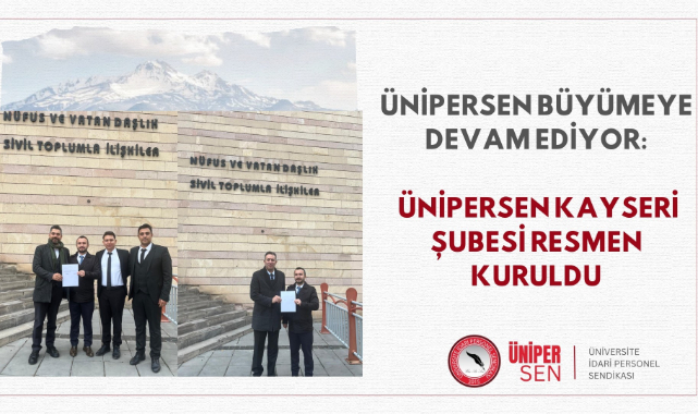 ÜNİPERSEN, yaklaşık 2 aydır yürütülen çalışmalar sonucunda Kayseri şubesi için gerekli yeter sayının tamamlandığını ve 11 Aralık 2025 tarihi itibarıyla ÜNİPERSEN Kayseri Şubesi'nin resmen kurulduğunu duyurdu. Sendikadan yapılan açıklamada, "Üniversite idari personelinin başını öne eğdirmeyeceğiz. Hangi ilde olursa olsun hakkın ve doğrunun yanında durmayı sürdüreceğiz. Hiçbir makamın gözüne bakmadan, hiçbir baskıdan çekinmeden eşit, adil ve çözüm odaklı bir sendikal anlayışı Kayseri’de de güçlü şekilde hayata geçireceğiz. Kayseri artık üniversite idari personelinin iradesini temsil eden kurumsal bir yapıya sahiptir. ÜNİPERSEN Kayseri Şubesi, bölgedeki tüm idari personelin beklentilerini duyuracak, sorunlarını görünür kılacak ve çözüm süreçlerinde etkin rol üstlenecektir. Sendikamız, çalıştıkça büyüyen, büyüdükçe daha güçlü adımlar atan bir yapıdır. Kayseri Şubemizin kuruluşu da bu kararlı yürüyüşün önemli bir basamağıdır. ÜNİPERSEN olarak Kayseri şubemizin tüm çalışma arkadaşlarımıza hayırlı olmasını diliyoruz. Bugün bir kez daha görülmüştür ki doğru yerde duranlar büyür, doğru sözü söyleyenler güçlenir, hakkı savunanlar asla kaybetmez" denildi.