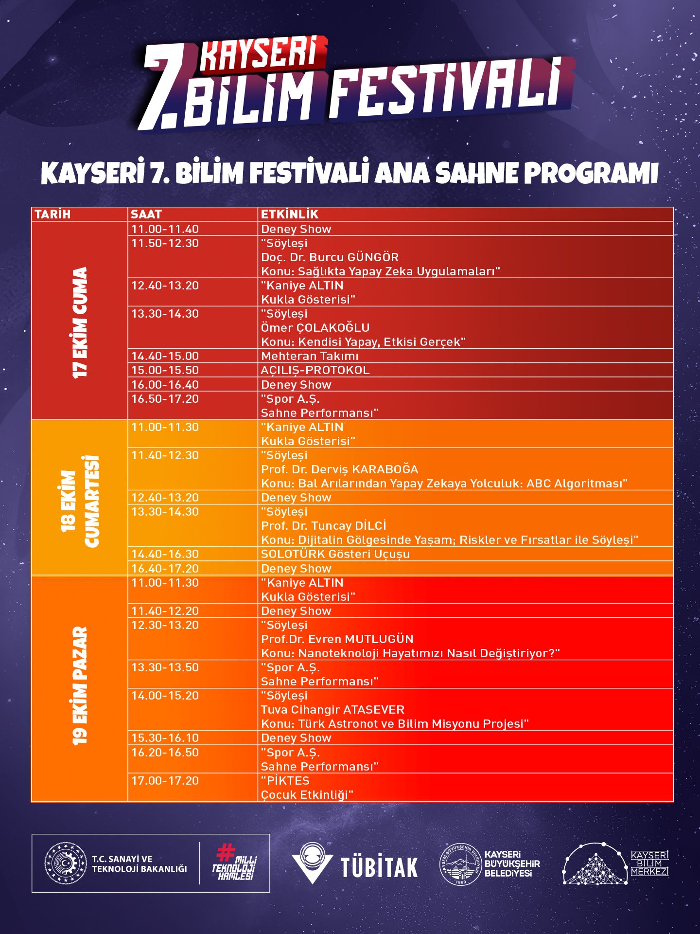 Kayseri Büyükşehir Belediyesi ile TÜBİTAK iş birliğinde düzenlenecek festival, bu yıl da bilim, teknoloji, uzay ve yenilikçilik ekseninde onlarca etkinliğe ev sahipliği yapacak.