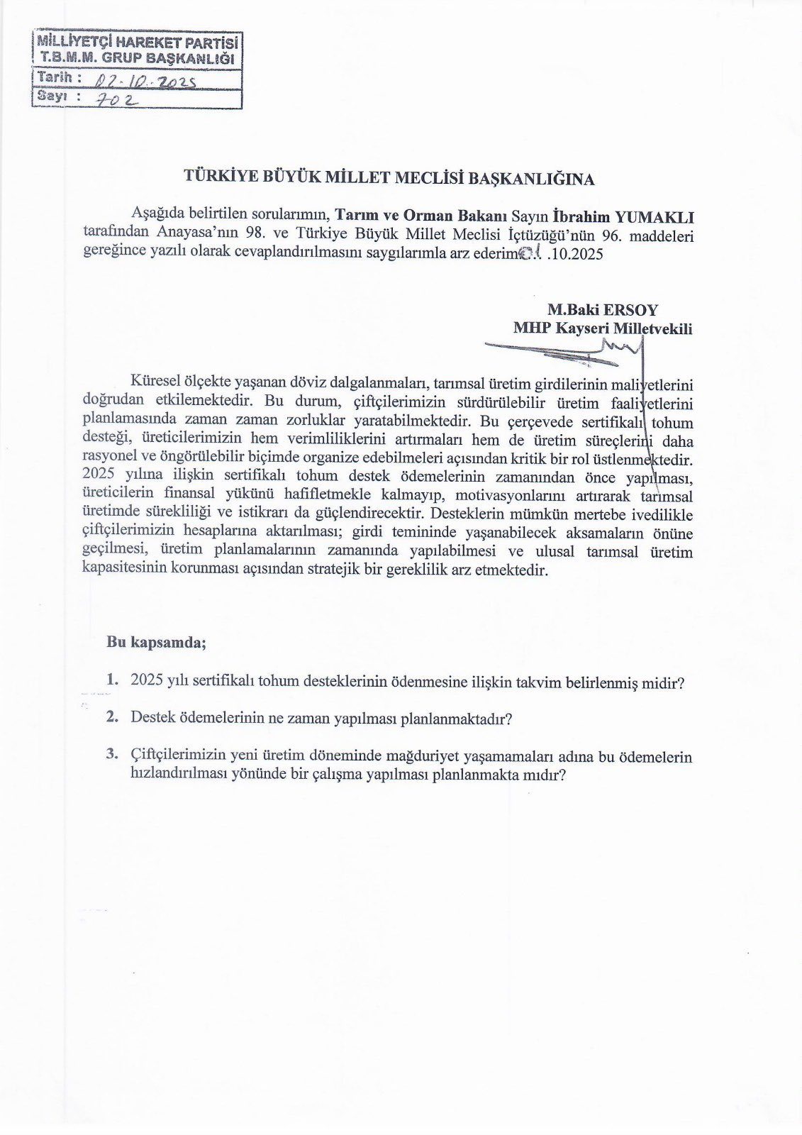 Milliyetçi Hareket Partisi (MHP) Kayseri Milletvekili Baki Ersoy; 2025 yılı sertifikalı tohum desteklerinin ödemelerinin zamanından önce yapılması için ilgili bakanlığa soru önergesi verdi. MHP'li Baki Ersoy, verdiği soru önergesinde şunları kaydetti: "Küresel ölçekte yaşanan döviz dalgalanmaları, tarımsal üretim girdilerinin maliyetlerini doğrudan etkilemektedir. Bu durum, çiftçilerimizin sürdürülebilir üretim faaliyetlerini planlamasında zaman zaman zorluklar oluşturabilmektedir. Bu çerçevede sertifikalı tohum desteği, üreticilerimizin hem verimliliklerini artırmaları hem de üretim süreçlerini daha rasyonel ve öngörülebilir biçimde organize edebilmeleri açısından kritik bir rol üstlenmektedir. 2025 yılına ilişkin sertifikalı tohum destek ödemelerinin zamanından önce yapılması, üreticilerin finansal yükünü hafifletmekle kalmayıp, motivasyonlarını artırarak tarımsal üretimde sürekliliği ve istikrarı da güçlendirecektir. Desteklerin mümkün mertebe ivedilikle çiftçilerimizin hesaplarına aktarılması; girdi temininde yaşanabilecek aksamaların önüne geçilmesi, üretim planlamalarının zamanında yapılabilmesi ve ulusal tarımsal üretim kapasitesinin korunması açısından stratejik bir gereklilik arz etmektedir. Bu kapsamda; 2025 yılı sertifikalı tohum desteklerinin ödenmesine ilişkin takvim belirlenmiş midir? Destek ödemelerinin ne zaman yapılması planlanmaktadır? Çiftçilerimizin yeni üretim döneminde mağduriyet yaşamamaları adına bu ödemelerin hızlandırılması yönünde bir çalışma yapılması planlanmakta mıdır?"
