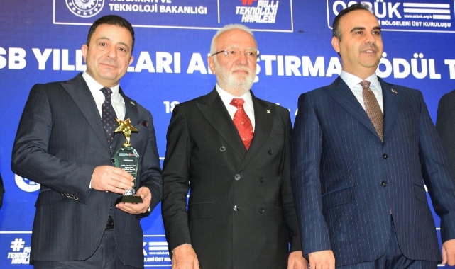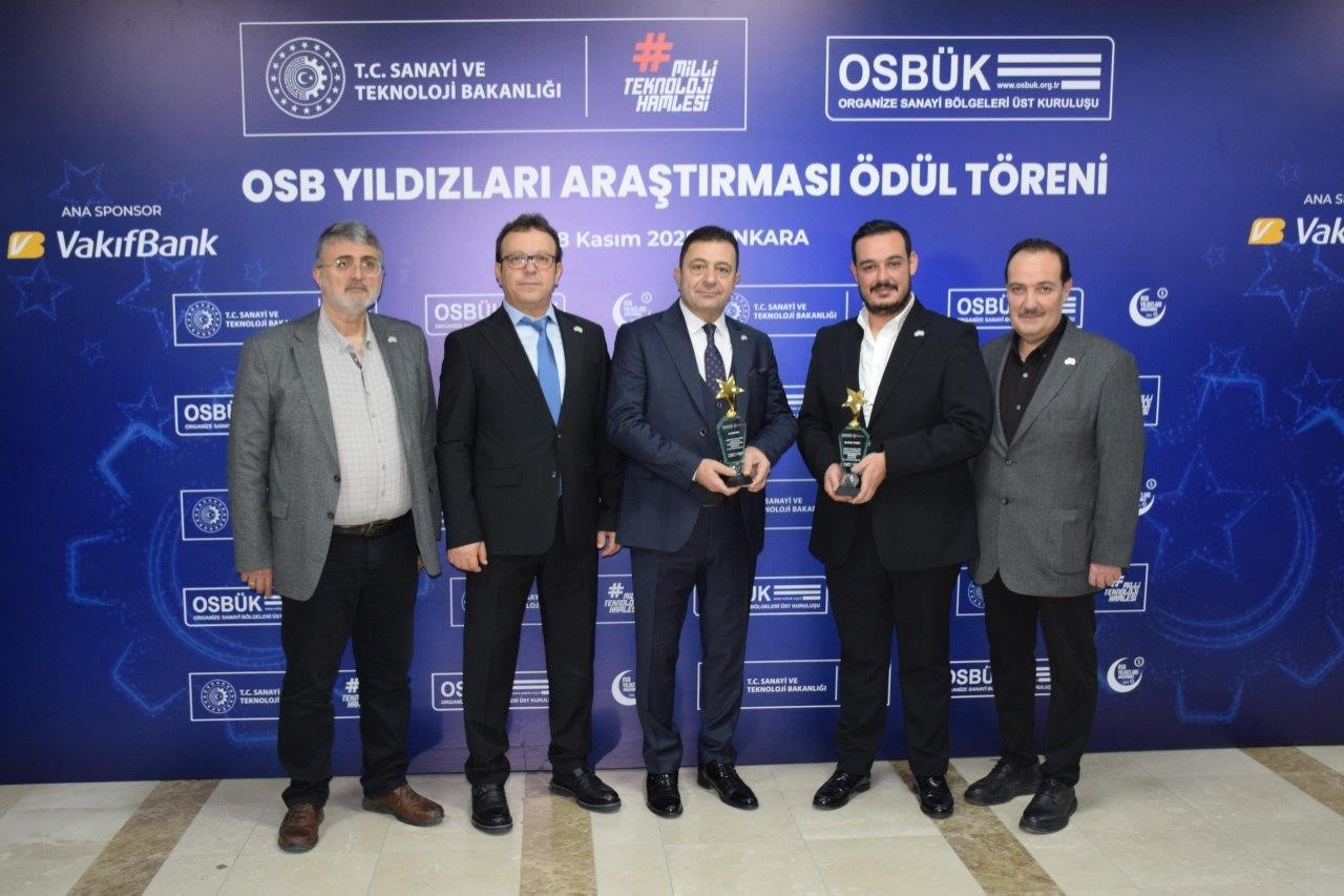 Organize Sanayi Bölgeleri Üst Kuruluşu (OSBÜK) tarafından bu yıl beşincisi düzenlenen, 2025 OSB Yıldızları Araştırması ödül töreni Ankara’da düzenlendi. Kayseri OSB Başkanı Mehmet Yalçın, Yönetim Kurulu Üyesi Kamil Çeken ve Denetim Kurulu Üyesi Mustafa Gengeç, Sanayi ve Teknoloji Bakanı Mehmet Fatih Kacır, AK Parti Genel Başkan Vekili Mustafa Elitaş, OSBÜK Başkanı Memiş Kütükcü ve davetlilerin yer aldığı törene katıldı.