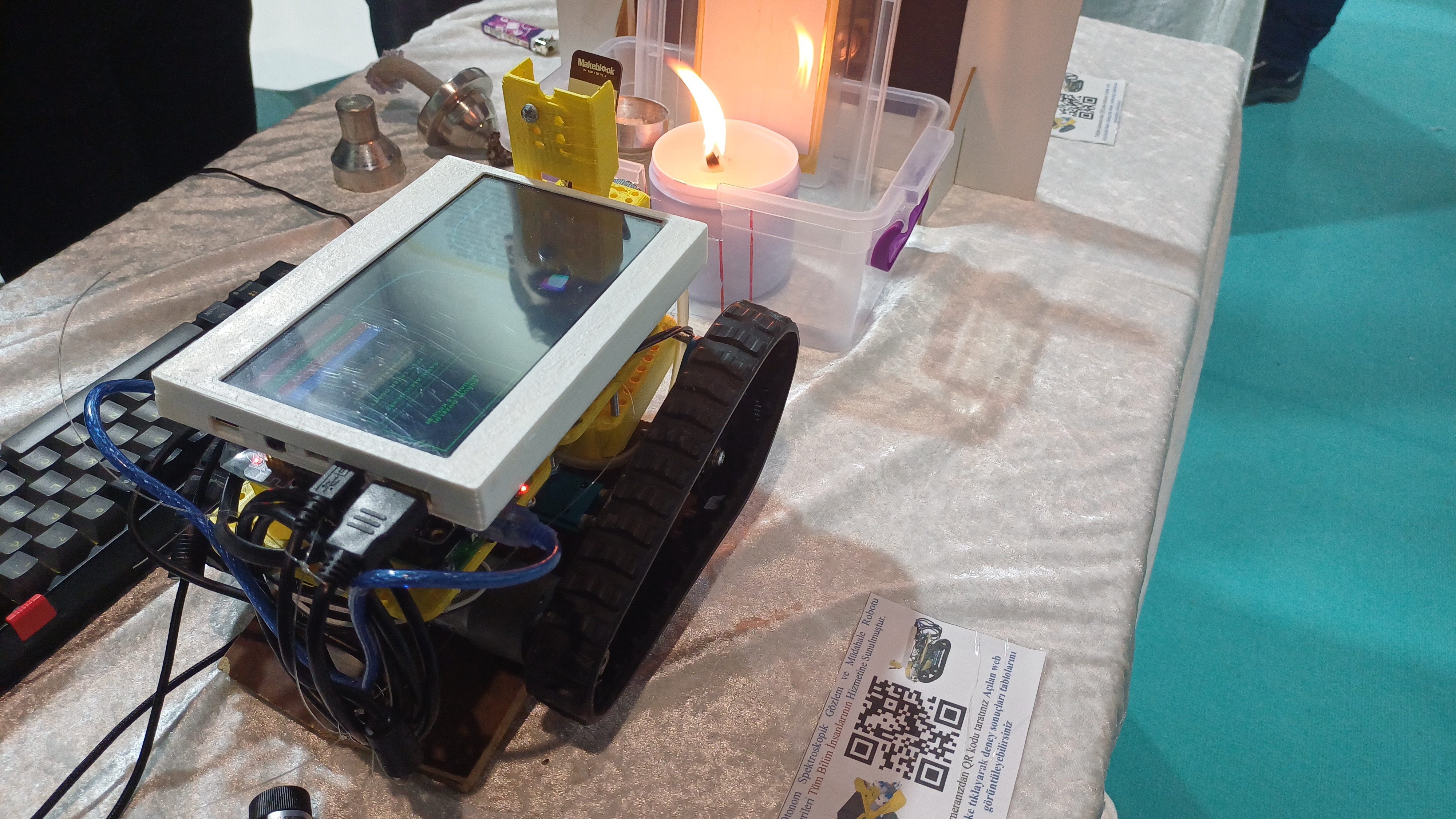 Kayseri'de lise öğrencilerinin yarıştığı 57. TÜBİTAK Lise Öğrencileri Araştırma Projeleri Yarışması'na katılan öğrencilerin geliştirdiği Otonom Spektroskopik Gözlem ve Müdahale Robotu, yangını otonom olarak tespit ederek sınıfına göre söndürme müdahalesi uygulanmasını sağlıyor.