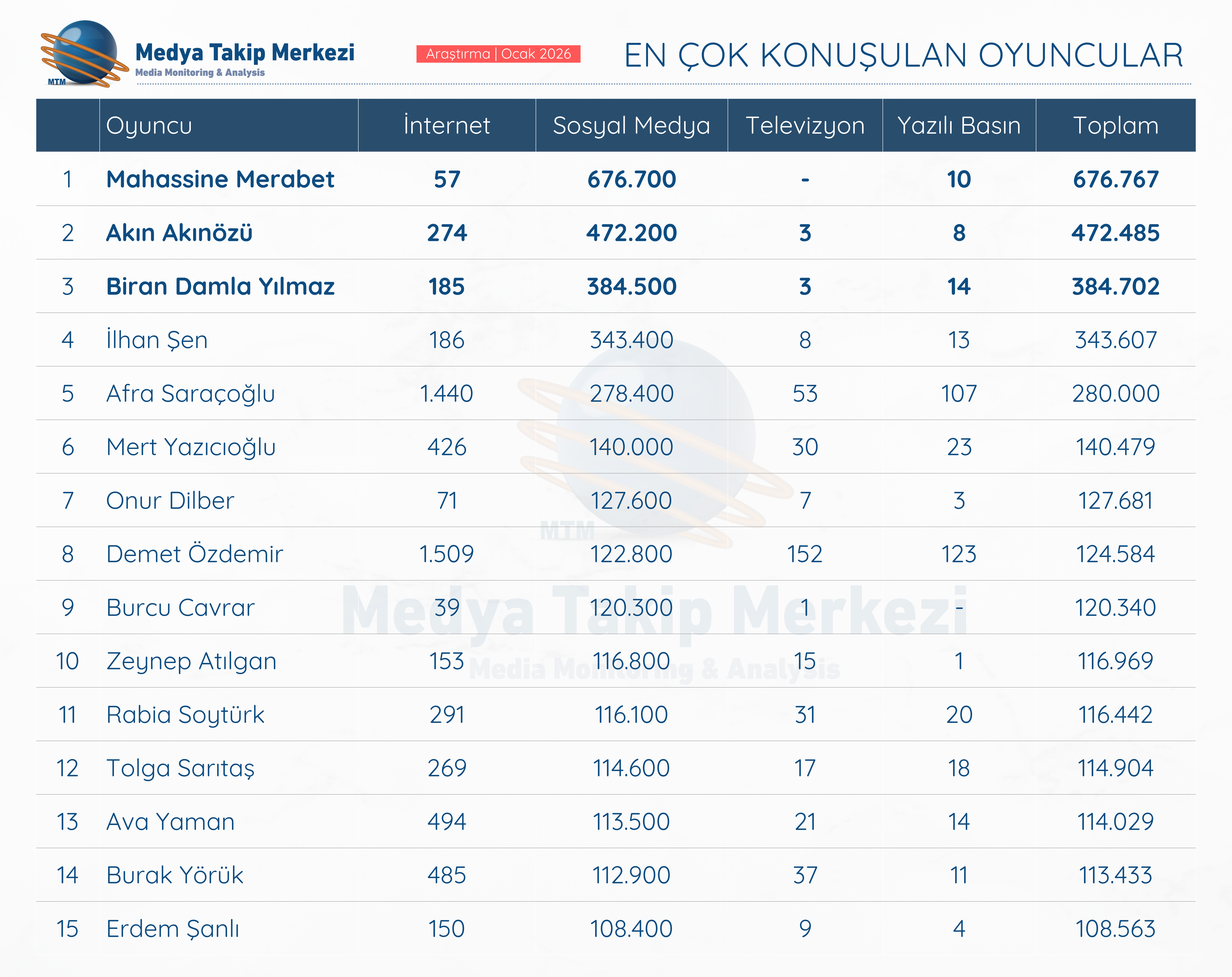 Sosyal medya, internet haber siteleri, televizyon kanalları ve yazılı basını kapsayan 10 bini aşkın kaynak üzerinden Medya Takip Merkezi tarafından 01–31 Ocak 2026 tarihleri arasında hazırlanan çalışma; ay boyunca oyuncuların hangi başlıklarla ve hangi mecralarda daha görünür olduğuna ışık tutuyor.